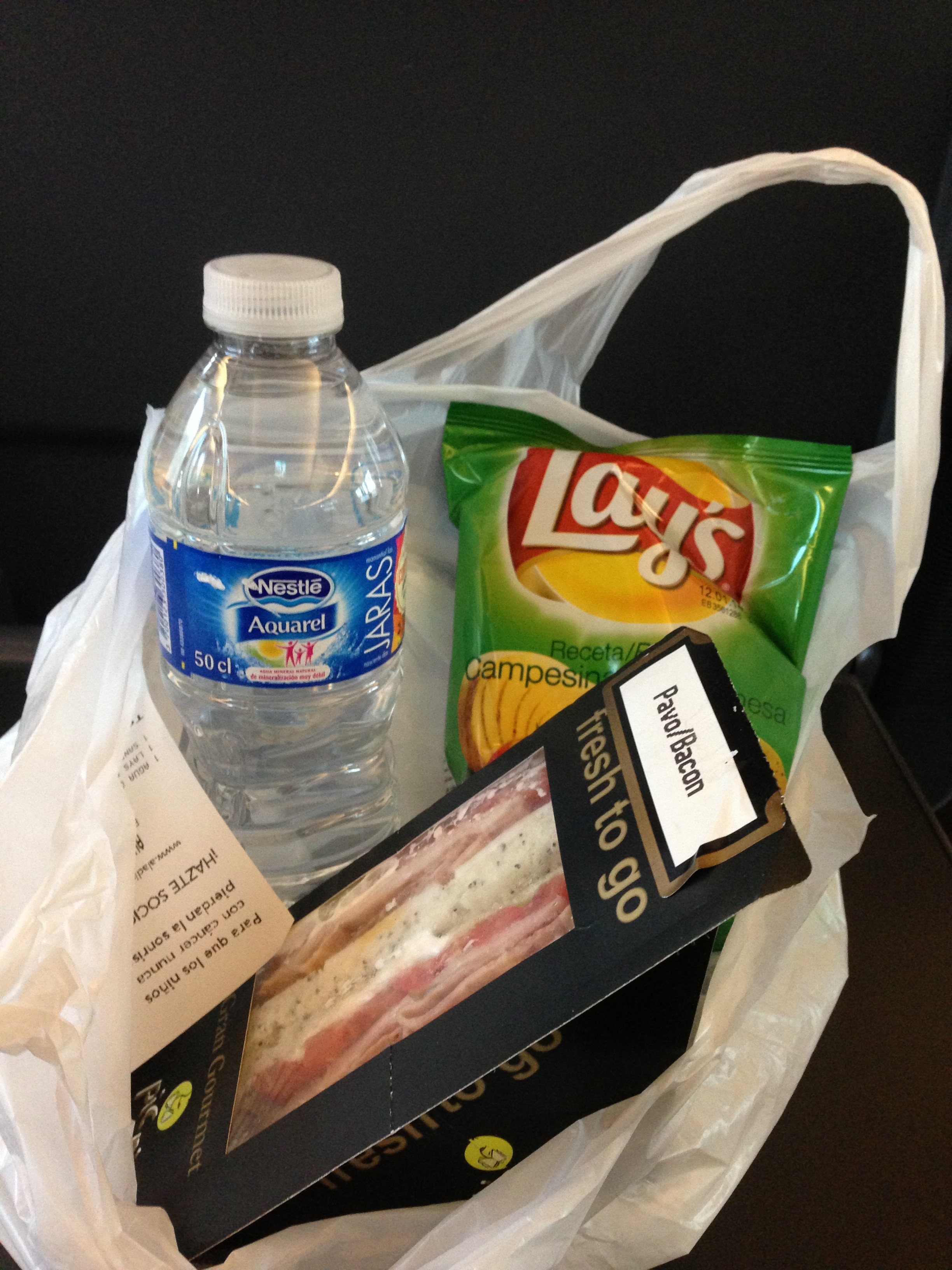 去到已經肚子極餓,我哋係車站商店買嘢上車食,最初實在未習慣歐洲o既物價,人哋又話西班牙啲嘢比起歐洲其他地方平o既,點解都仲係咁貴o既?最後只係買咗一份三文治,一支水同埋一包薯片(安慰作用)兩份share咋,因為要分開坐,所以講好我食完再拎過去俾day~