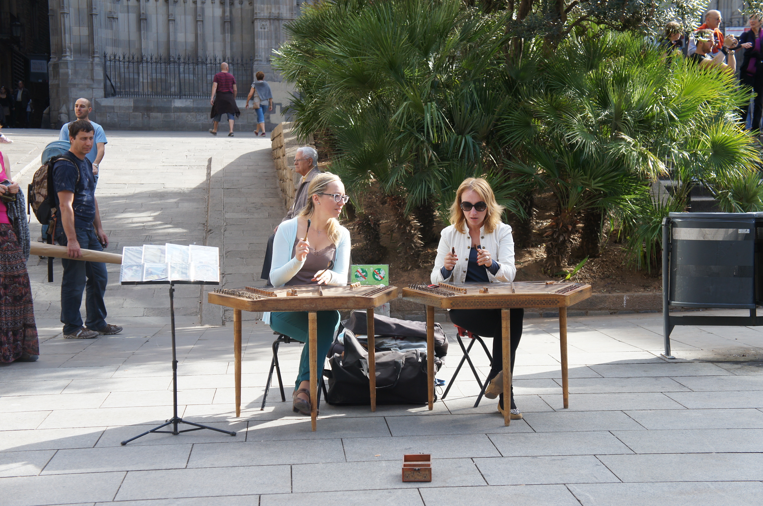 西班牙處處都非常多街頭賣藝,最常見係小提琴、結他、手風琴等,但呢個都算係數一數二特別了,居然有兩個白人女子彈中國人o既揚琴乎?不過佢哋除咗一般o既敲之外,仲有用手去彈,而演繹o既歌曲係經典流行曲囉,唔能夠話佢唔好聽,但有少少別扭咁~