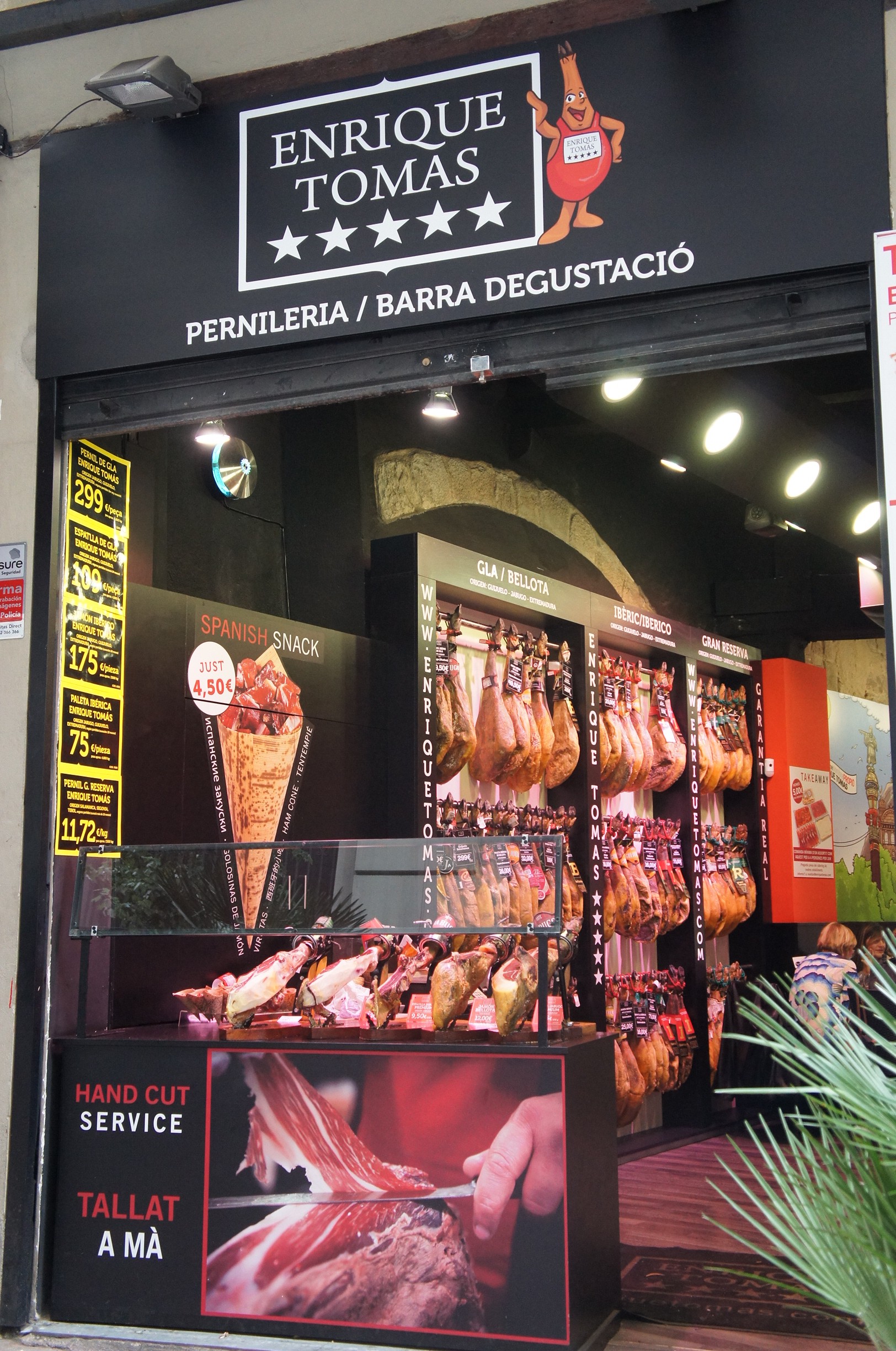 行咗出嚟,係比較熱鬧o既街道,好多鋪頭,我哋第一次遇到火腿專門店,咁多隻脾掛晒係度,叫人歎為觀止,而且價錢都貴o架喎~係西班牙食餐or麵包,乜都加啲火腿落去,佢哋真係好鍾意食呢~呢啲按kg計o既火腿都唔係好敢買,難以估計幾多錢有幾多片囉~所以後來我哋都係買一pack pack嗰啲~係機場回程時,又遇番香港空手道隊,聽到教練(估)同家人講電話話佢買咗隻脾﹗﹗犀利咯~返去點樣分??一定切到好攰﹗我哋見鋪頭啲人「片」啲火腿出嚟,好似都好有技巧咁~