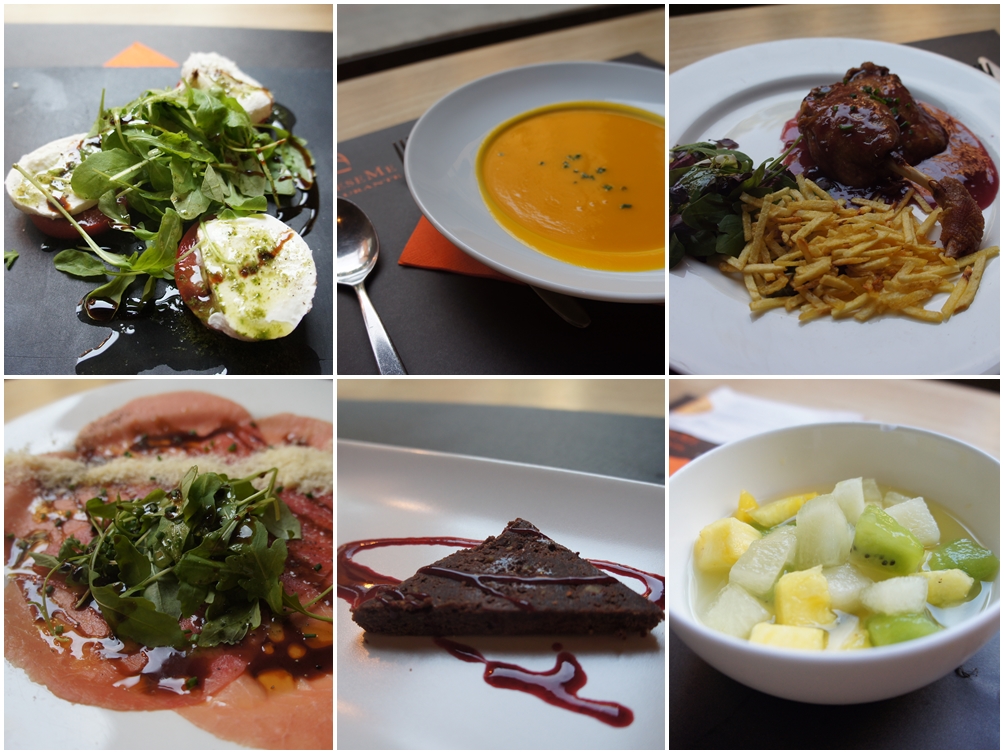 嚟到西班牙第一樣令我食到瞇眼o既食物就係左上角o既蕃茄芝士了,芝士口味清淡,但質感濃厚,加上清新juicy o既大肉茄,非常正~上中o既南瓜湯相對就失色少少了,因為係一般o既好味道~至於右上o既主菜係燉鴨腿,哇,咁快就出現第二樣瞇眼食物?因為鴨腿超腍同入味,點解可以咁嫰滑o既呢,中國人煮鴨好少係呢種狀態~餐牌雖然有英文,但有啲係好專門o既菜式名字,我哋都唔係好曉,見到有個beef,諗住實冇死,點知係生肉片,冇話好腥,我都食到,但肉味唔明顯,質感似sashimi,不過不失啦~甜品o既brownie都屬中上o既佳品,再以fruit salad作結就perfect了﹗我哋兩個人,一般都會有三道菜變成咗六道菜,正﹗所以話「兩個人總比一個人好」,冇錯o既~