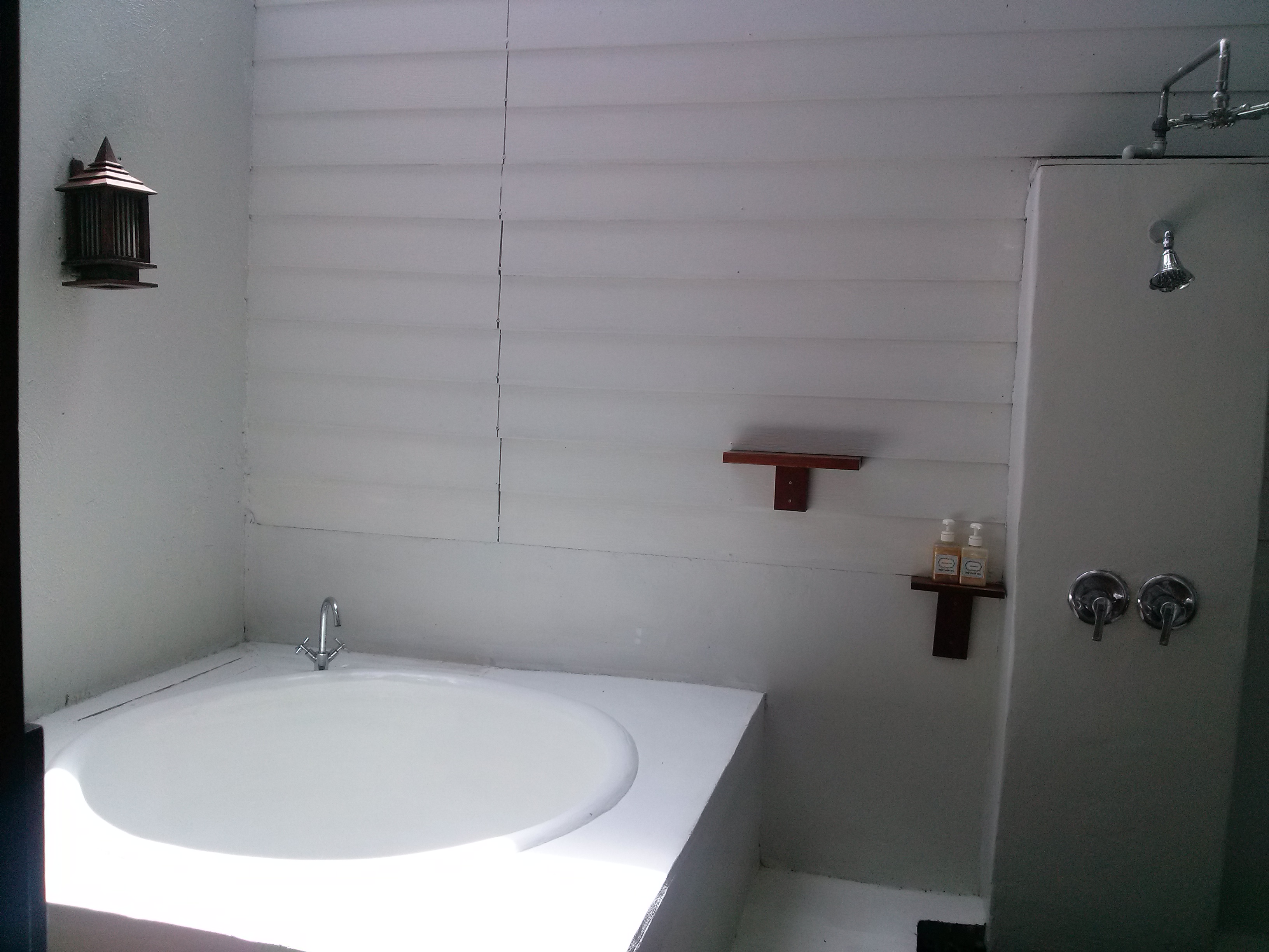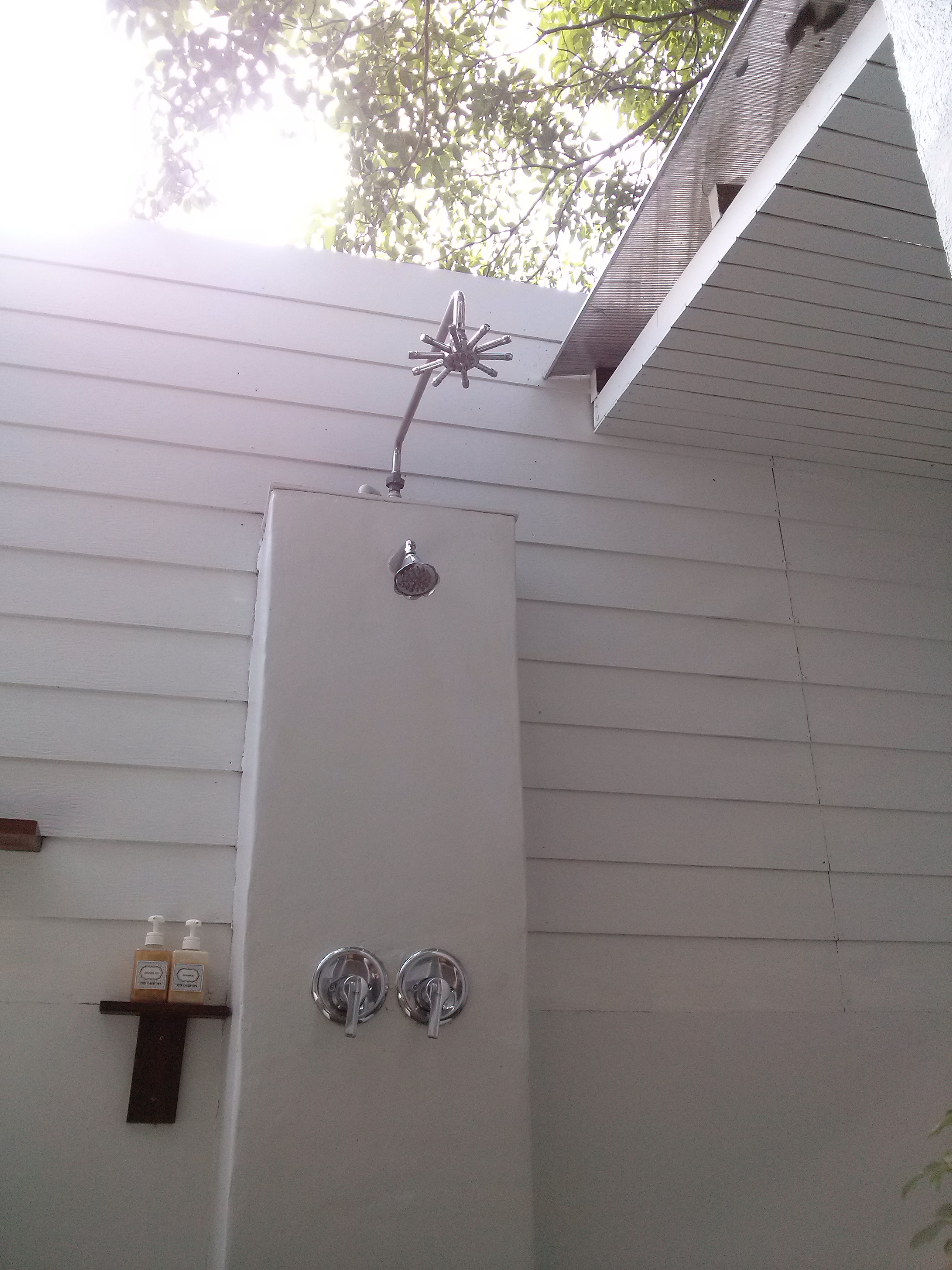 呢個就係沖身o既半露天shower,抬頭係藍天同埋樹蔭,聲音唔係音樂而係雀仔叫聲,又有私隱又貼近大自然,好good o既設計﹗