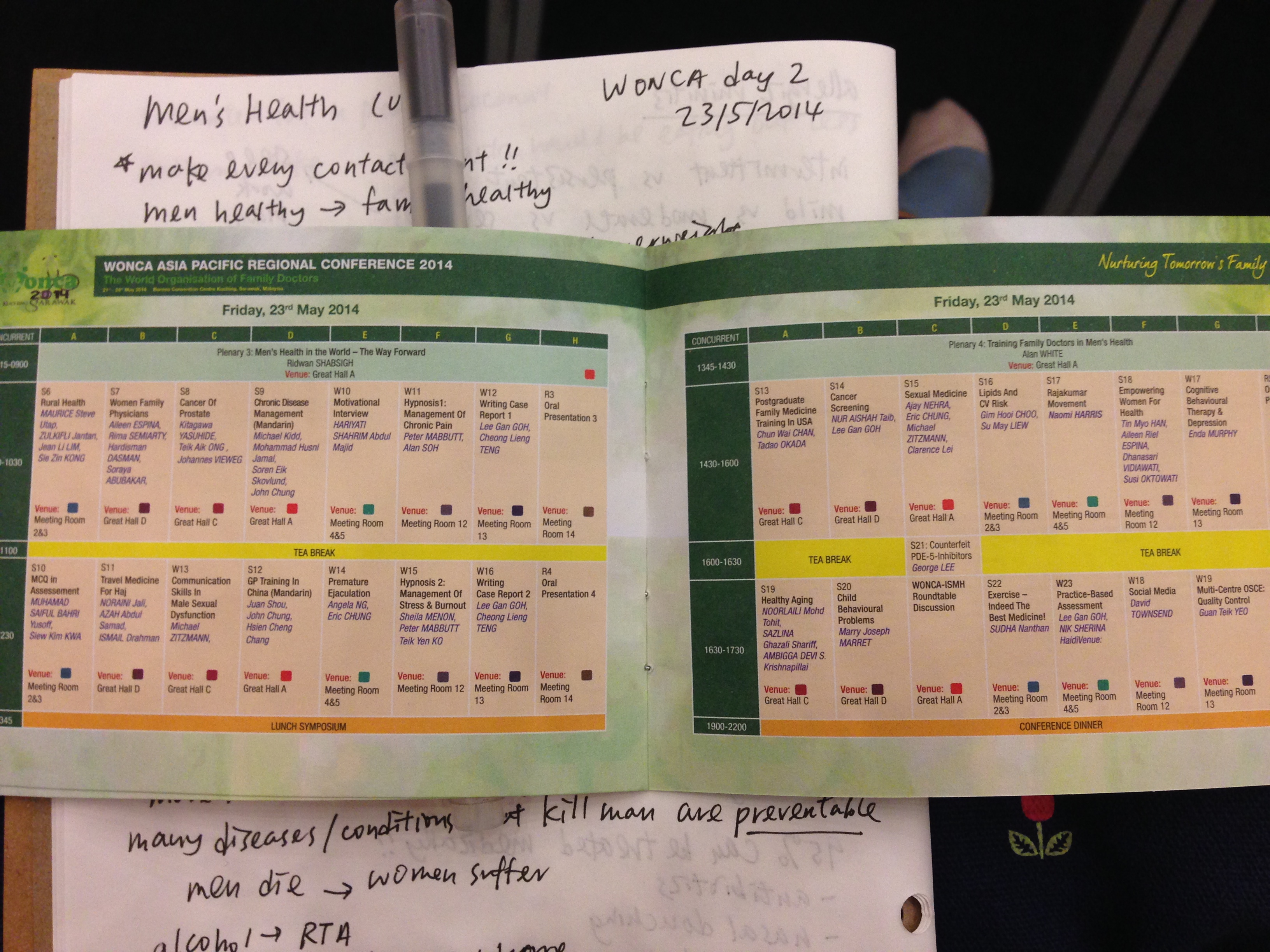 第二日嘅WONCA比起第一日更長呢,programme由八點三一直至五點三﹗之後仲有conference dinner添,不過我又唔識人,所以冇報名參加呀~經過尋日截的士嘅氣憤經歷之後,我今日唔會犯相同嘅錯了﹗尋晚call咗T&T的士call台嘅車嘛,我叫個司機早上嚟接我,哈,點知我自己個鬧鐘都未響時電話竟然響咗喎,有人問我七點半係咪要的士﹗﹗原來尋日個司機唔得閒,佢搵咗佢嘅同事嚟接我,咁三唔識七梗係confirm下先駛駕車嚟啦~okok,唔該晒,陣間見~IMG_4144 好早去到會場,正好食咗我私伙小早餐先,因為tea break要十點半,唔食少少嘢先就超餓了,我早一晚係The Spring買定個pretzel嚟食,sour cream味又幾特別喎,正﹗ 先係plenary session,呢堂講得都好好呀,講Men’s Health,好多人relate Men’s health = urology,其實男人同女人嘅分別除咗生殖器官之外,有好多男女都有嘅疾病呢,男人患病率都高好多,好似心血管疾病啦、某啲癌症啦,當然同男人嘅生活習慣有關啦,例如男人吸煙比例高好多,而且男人亦傾向唔向醫生求助,更加少會去搵個醫生只做身體檢查,所以作為家庭醫生嘅我哋,更加要特別關心男人們﹗一有機會時就要諗辦法幫佢哋減低風險了﹗﹗IMG_4145 跟住就到parallel session了﹗同一時間有八個選擇﹗﹗IMG_4146 上晝第一堂我揀咗Women’s Family Physicians,呢堂嘅講者係幾位劫後餘生嘅女家庭醫生,係天然災害、人為災害之中點樣作為女性、作為媽媽、作為一個醫生去support佢嘅community﹗