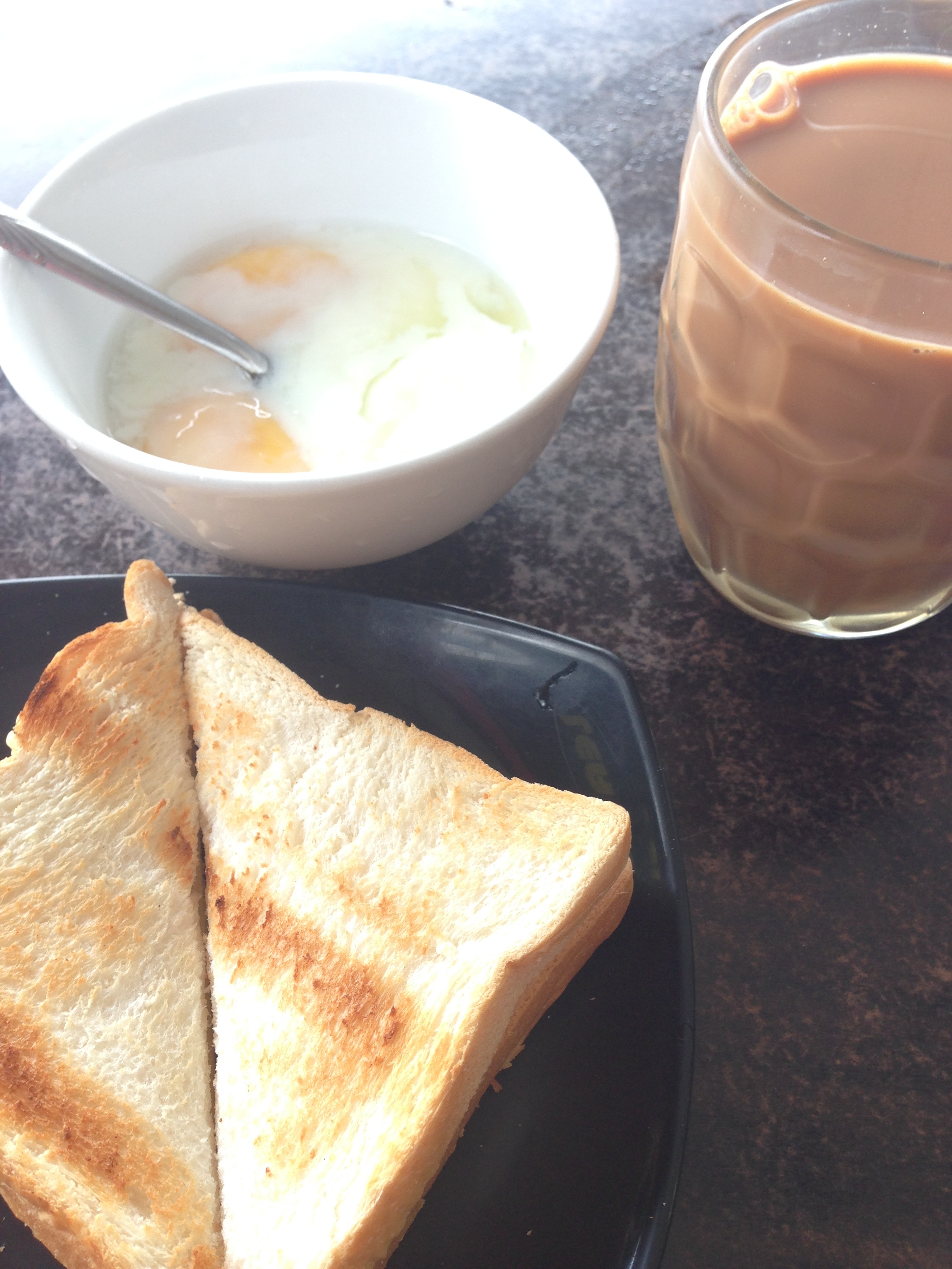 我揀咗嘅xx cheese餐原來個cheese係多士﹗令外有兩個半熟水煮蛋,咖啡或茶任君選擇﹗咦,個蛋點食嘅呢?waitress同時放低咗豉油同埋胡椒粉,估計係同個蛋一齊食吧?我就樣樣放少少啦~後來有個馬來西亞華僑同學仔同我講,係要加豉油拌勻嚟食嘅~我都啱啱地啦~不過佢生生地我都係有啲驚,唔敢食太多⋯奶茶已經加好糖俾你,哇,超甜奶茶﹗﹗令人回味印度嘅chai呢~所以當年係印度叫chai有得叫半杯都幾好(請參閱:20-4-2008:小休息的星期天),淺嚐一下過下癮又唔怕食得甜太多~(其實已經好多⋯>.<“)