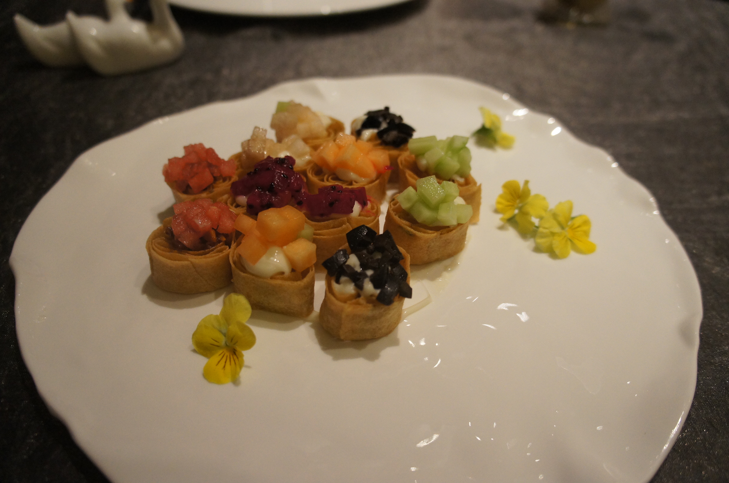 前菜我哋叫咗呢個--好靚嘅花束﹗底部嘅脆脆好似係北京嘅傳統小食,唔記得叫咩名了,上面配咗各樣鮮果,再加上花花配襯,睇起嚟賞心悅目,食落去清新又開胃﹗我哋一口一個,兩個人share,全部口味都試齊了~