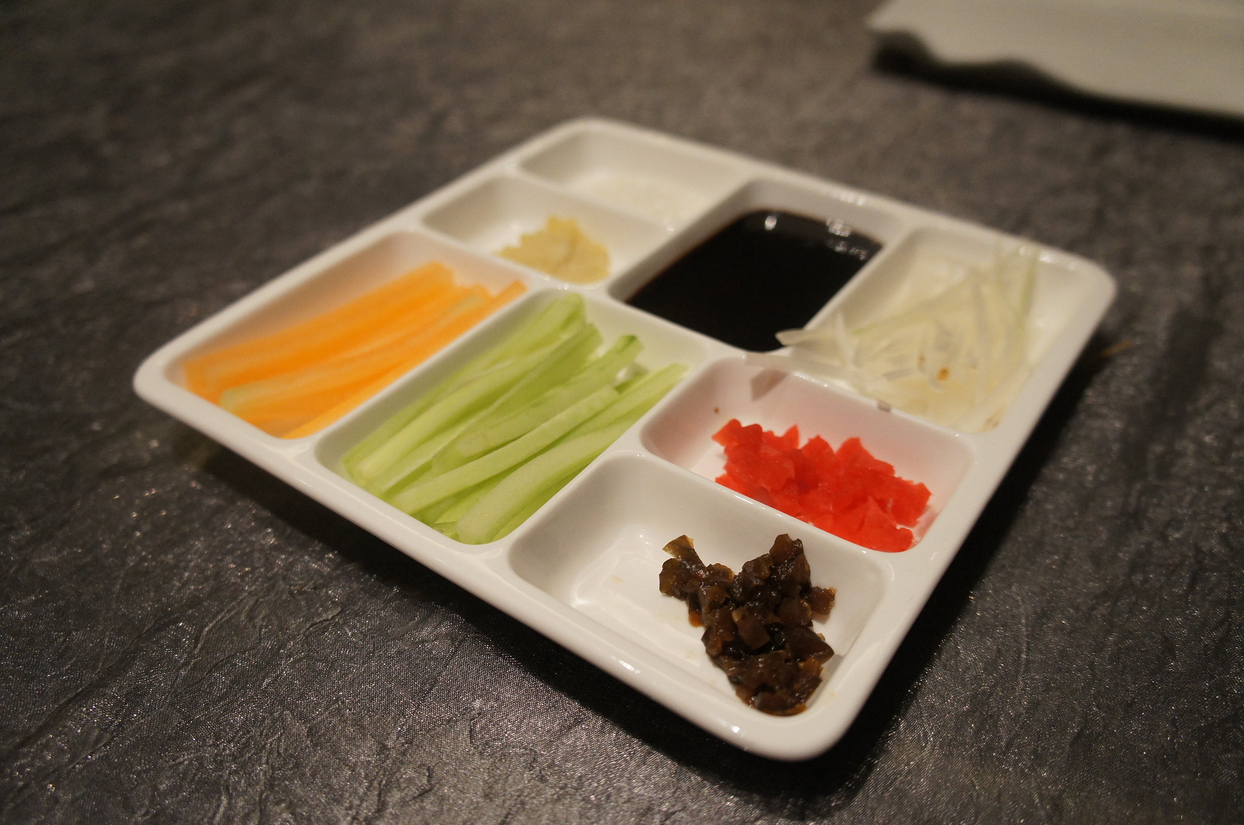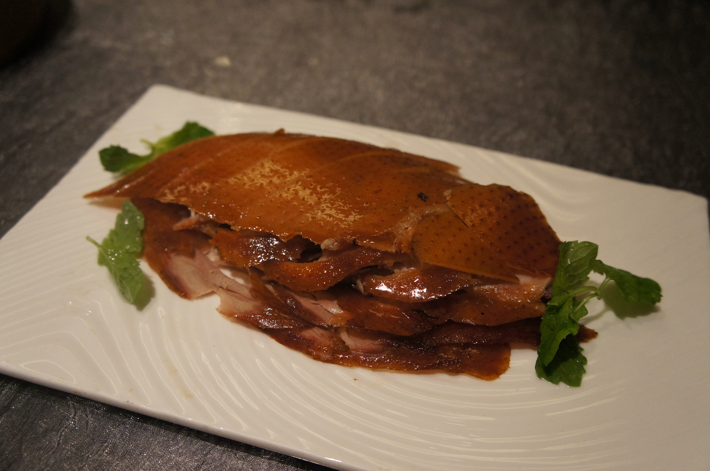 主角出場了﹗其實鴨總共有三碟﹗﹗我哋係餐牌上見唔到有半隻嘅option,所以我哋兩個人食咗一隻﹗﹗所以「兩隻肥嘢」就係咁嚟㗎啦~(兩隻肥嘢嘅典故請參閱:25-5-2013:釜山麗水day 1(part 3).麗水世博之Aqua Planet水族館)北京烤鴨同香港食嘅烤鴨最大嘅分別係,佢哋每件都係皮連肉,而且鴨比較瘦(家姐話呢個係大董烤鴨嘅特色而唔係北京烤鴨嘅特色喎),皮之下就係肉了,冇乜肥膏~所以口味相對淡,又唔會太膩,可以食多幾舊﹗兩件夾落一塊薄餅入面就最good﹗
