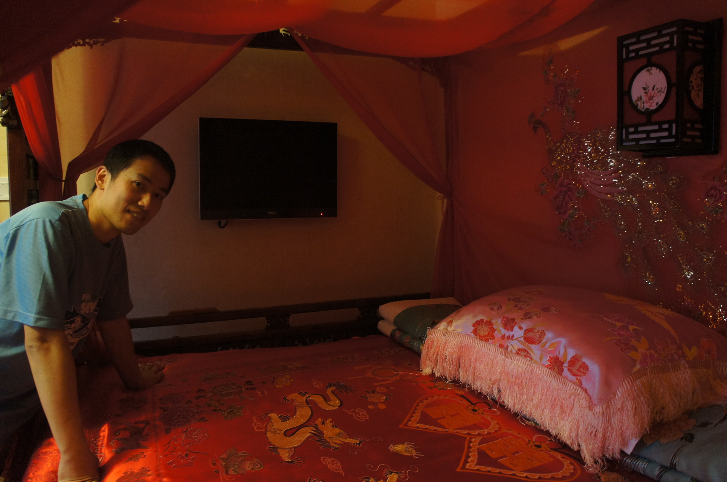 蜜月套房至有嘅公主床同埋龍鳳被呢~好高興啊~不過龍鳳被原來只係裝飾用途,好在趁早影咗相﹗晏少少有職員拍門入嚟,原來佢會幫你再鋪床,換上實用又方便清洗嘅白色被鋪,都好丫,衛生啲~