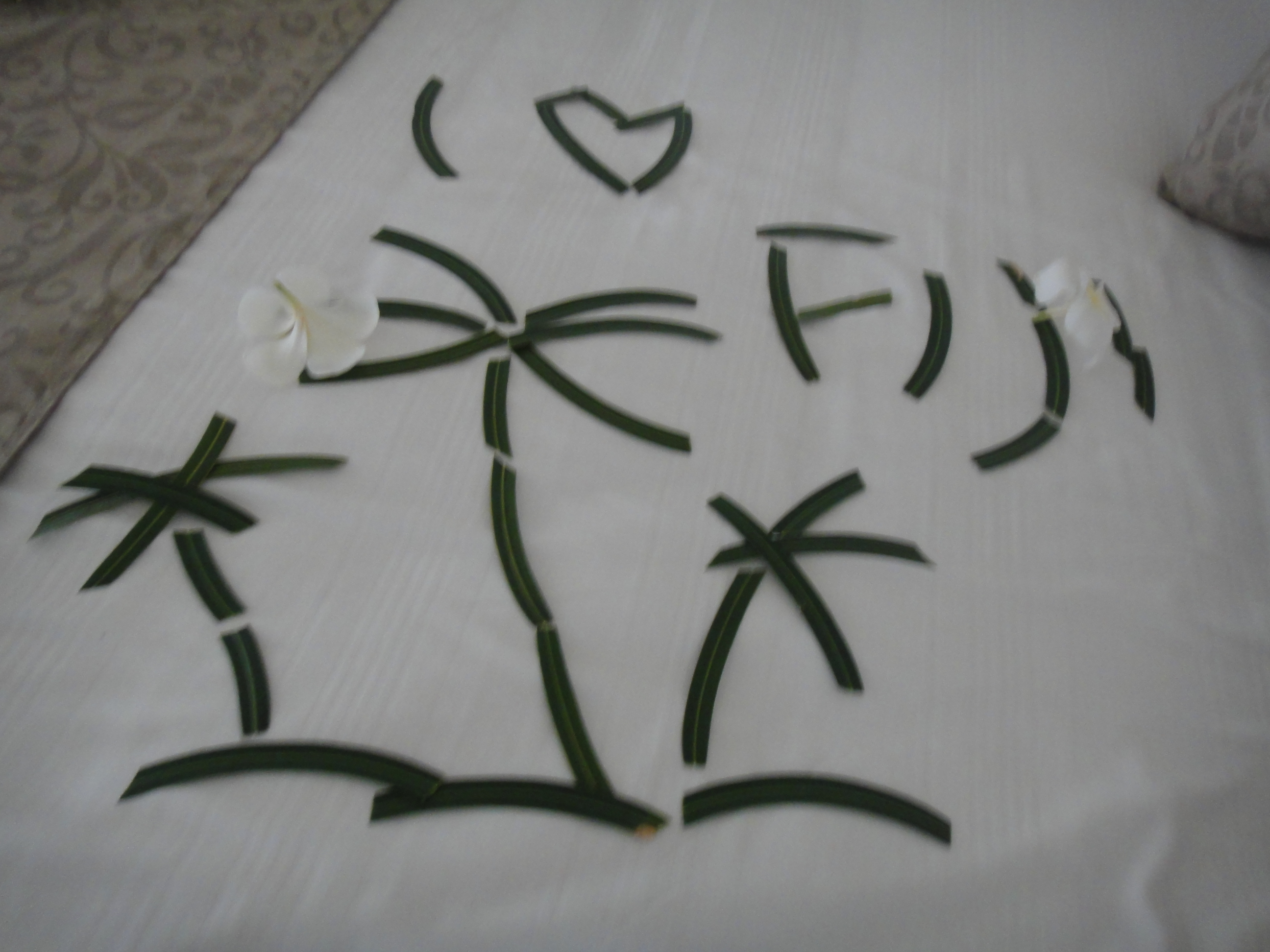 返房沖一沖身至去傍晚嘅節目,你睇下day幾creative?又用一樣嘅葉子砌出另一幅畫~又好有熱帶風情bor~DSC03768