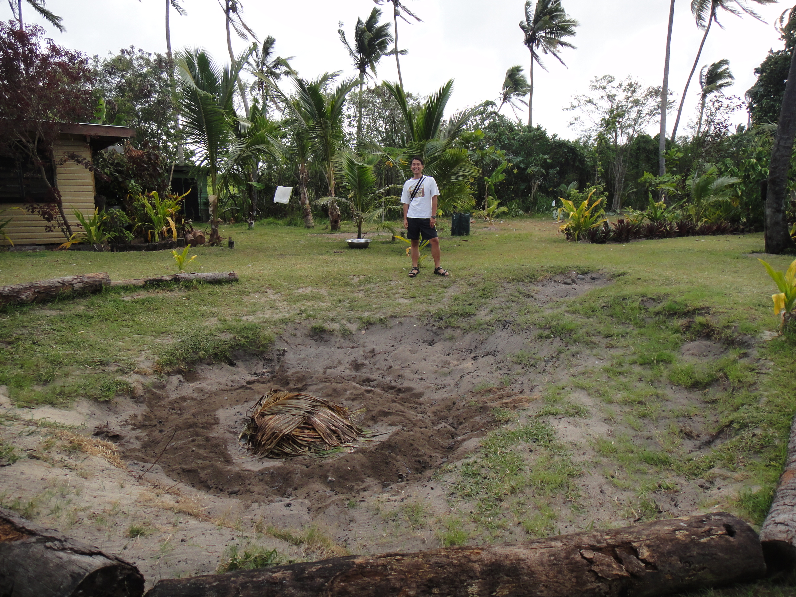 差唔多時間到Lovo出土同埋Firewalking表演了,我哋去凑凑熱鬧先﹗乜嘢叫Lovo?睇下中間嗰堆葉子~其實Lovo係Fiji人煮筵席嘅方法,特別適合煮好多好多人嘅份量,其實主要係用石頭嘅熱力去烤熟食物﹗首先挖個洞洞,係裡面用熊熊烈火燒熱一堆石頭,之後就放用葉子包好嘅肉類入去,仲有啲根莖類植物,堆堆堆堆堆啲土上去蓋住,煮個兩三個鐘就ok了,之後熟咗嘅食物就可以「出土」啦~