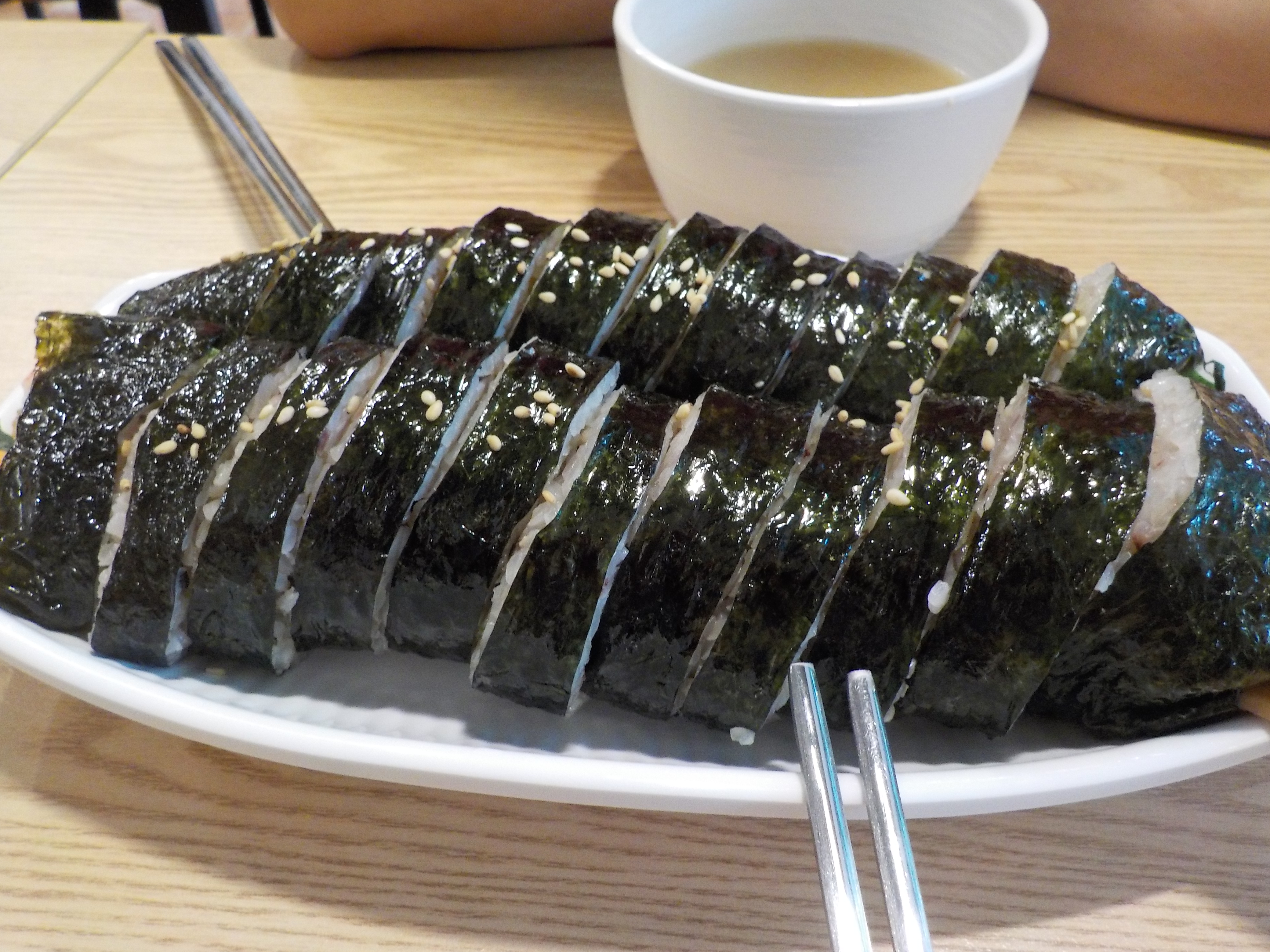 又發生咗「黃花魚事件」,上次去麗水時我哋指個餐牌個中文,點知個中文名近另外一款餸個韓文多過我哋想點嗰款(請參閱:26-5-2013:釜山麗水day 2(part 2).麗水市隨意走),今次又係丫,原本想叫飯糰同烤肉紫菜卷,而家變成兩條紫菜卷了,一條原味一條烤肉,都ok嘅~我怕怕烤肉紫菜卷嗰啲紫蘇葉味,所以問day我可唔可以淨係食原味嗰條+少少烤肉⋯hee,我個老公真係好喇~