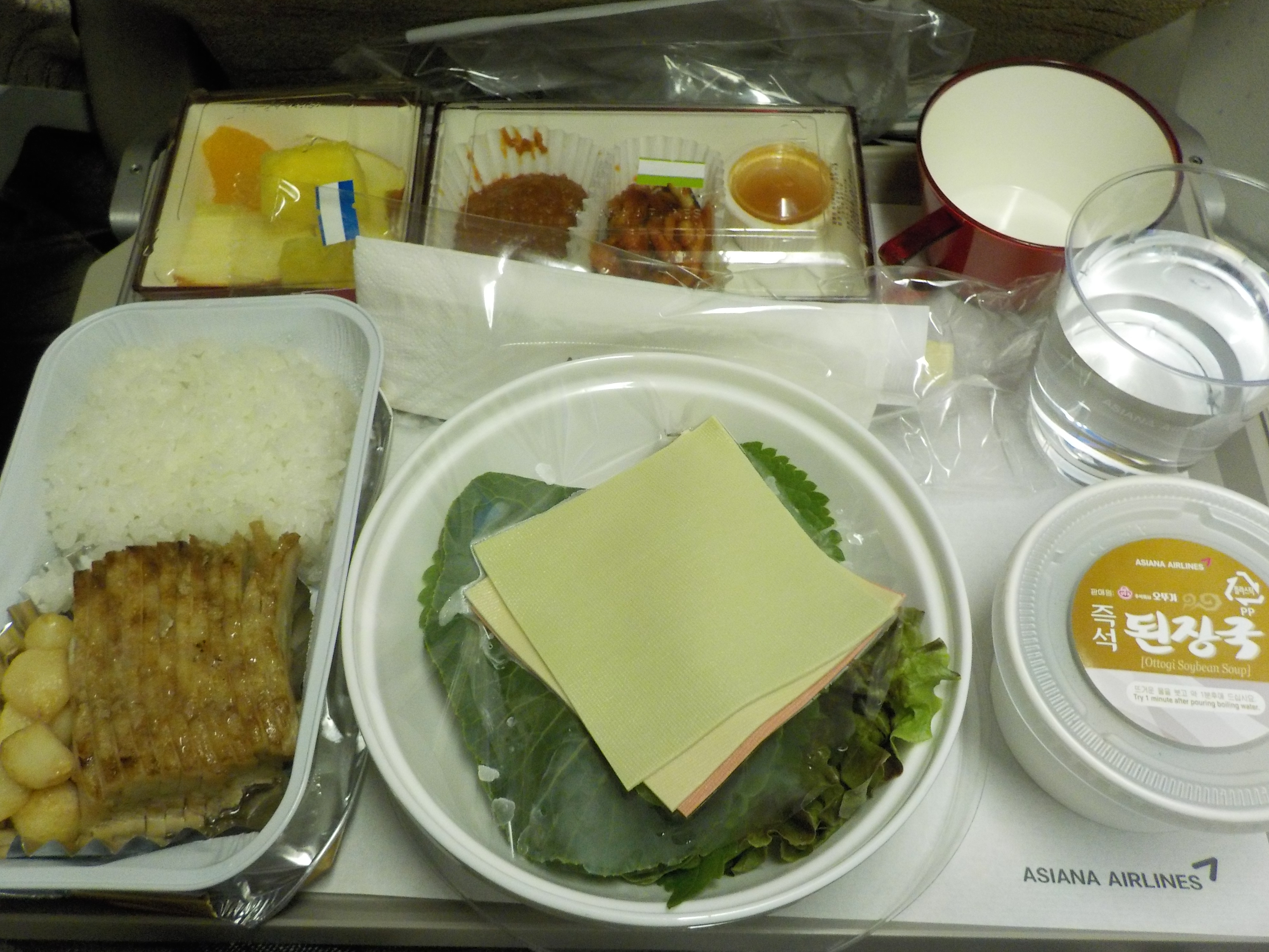 居然飛機餐會有生菜包烤五花肉﹗菜都有幾款,上面嘅係豆皮,肉都俾得好闊綽,可能為咗外國人嘅口味吧,蒜頭唔係生蒜,而係煮熟的,仲附上麵豉湯啊~