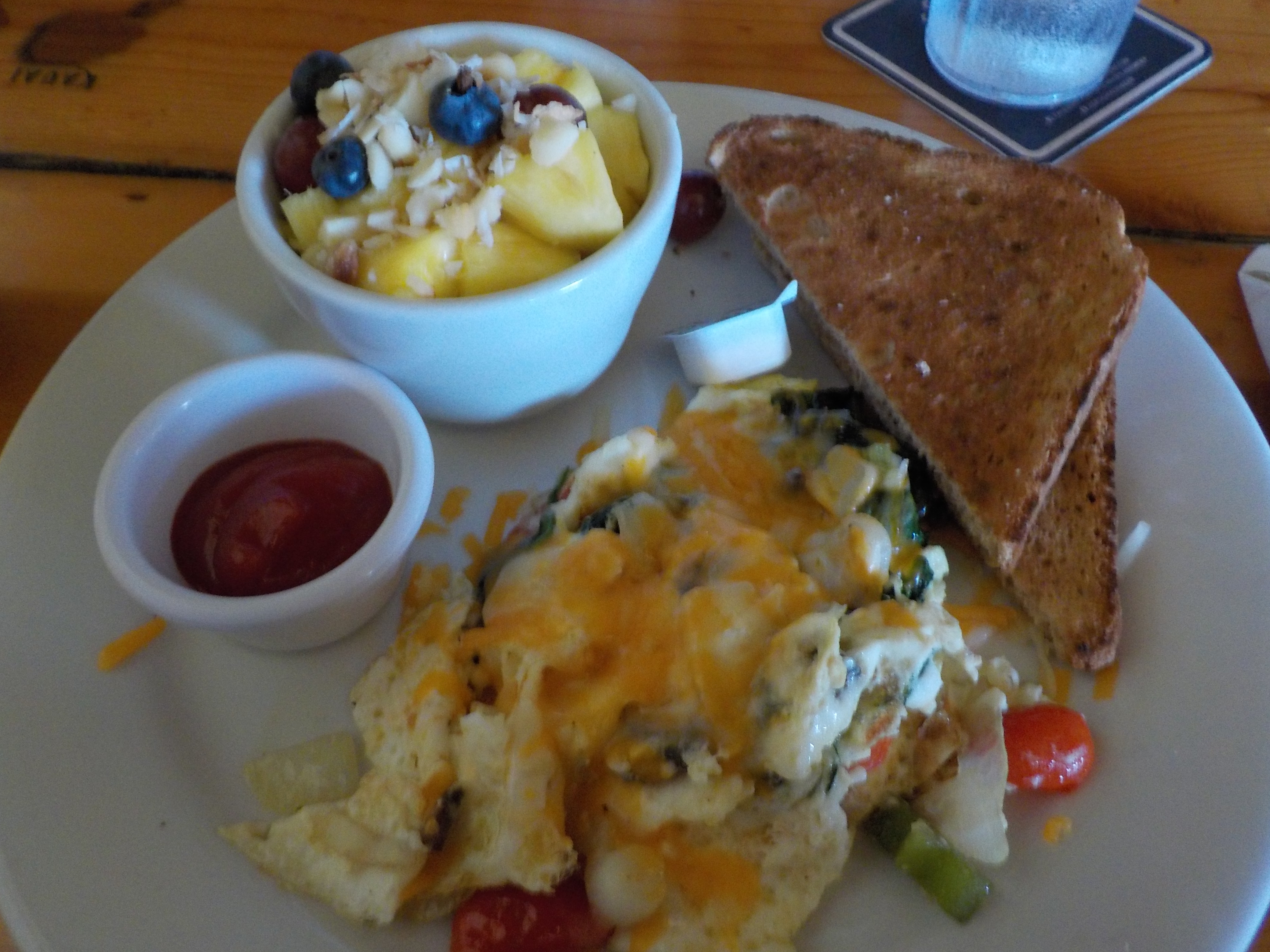 為咗唔好食得咁heavy,我哋揀咗Healthy Choices底下嘅Garden Isle Scramble,有雜菜芝士蛋白奄列、全麥多士、水果杯,我就飲橙汁,day當然係咖啡啦~不過可能都係太素,食完飽就飽,但滿足感就好似差少少⋯下次都係要食番少少肉⋯:p同埋唔知鬼佬係咪唔識得用鹽水浸住切好嘅新鮮菠蘿呢?夏威夷食到嘅菠蘿好多時都比較刺激喉嚨,嗱,要好好學習啦~