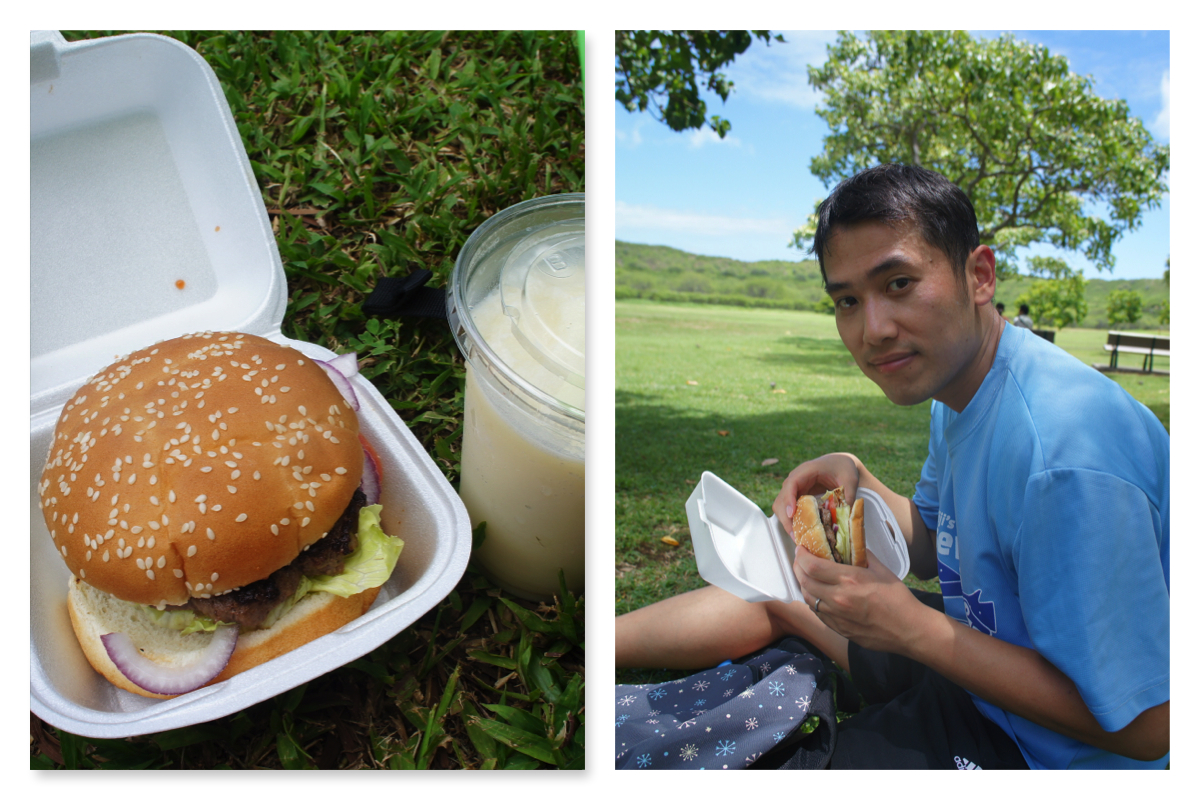 因為唔食假味刨冰,我哋食咗漢堡包同埋pina colada smoothie,兩樣都好正﹗真材實料,肉烤得香香的,加埋夠新鮮夠脆嘅新鮮蔬菜,正~smoothie味道都好rich呢~呢度有大大草地有樹蔭,係度野餐一流丫﹗返到嚟香港都好想去下野餐呢,地點有咩好推介?
