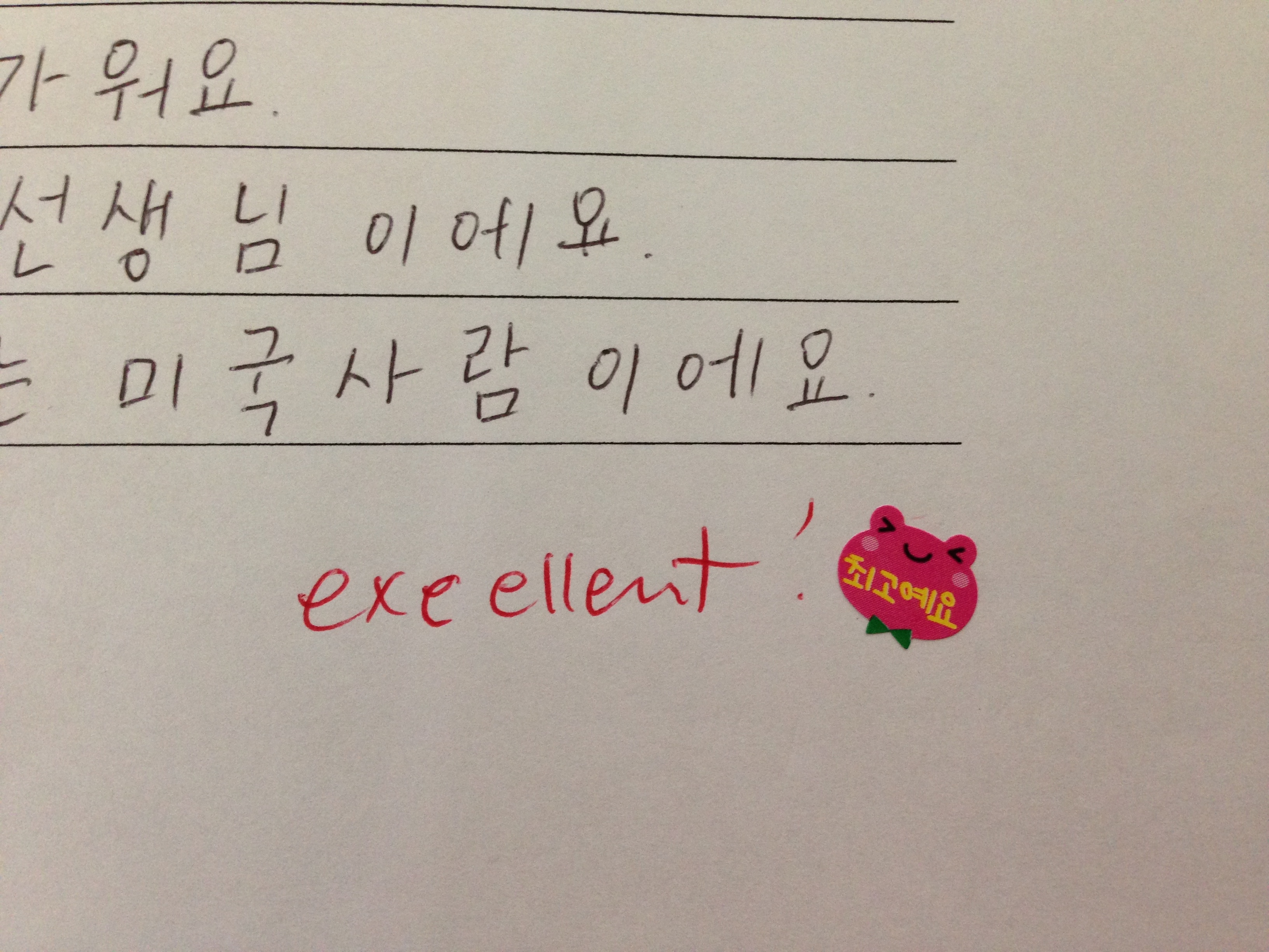 高興嘅除咗自己真係學多咗嘢之外,睇韓劇好似識得聽得多咗少少(例如睇「沒關係,是愛情啊」入面講女主角叫姐夫唔好成日飲酒,姐夫話「一支啤酒啫」,以前就唔識聽,而家佢講「맥주한병」我就識聽了﹗yeah~),老師嘅認同都好重要呢,好似讀中學時嘅「好名」咁~收番功課返嚟見到張貼紙就笑咪咪了,那管我已經係30歲嘅大人﹗:DIMG_5172