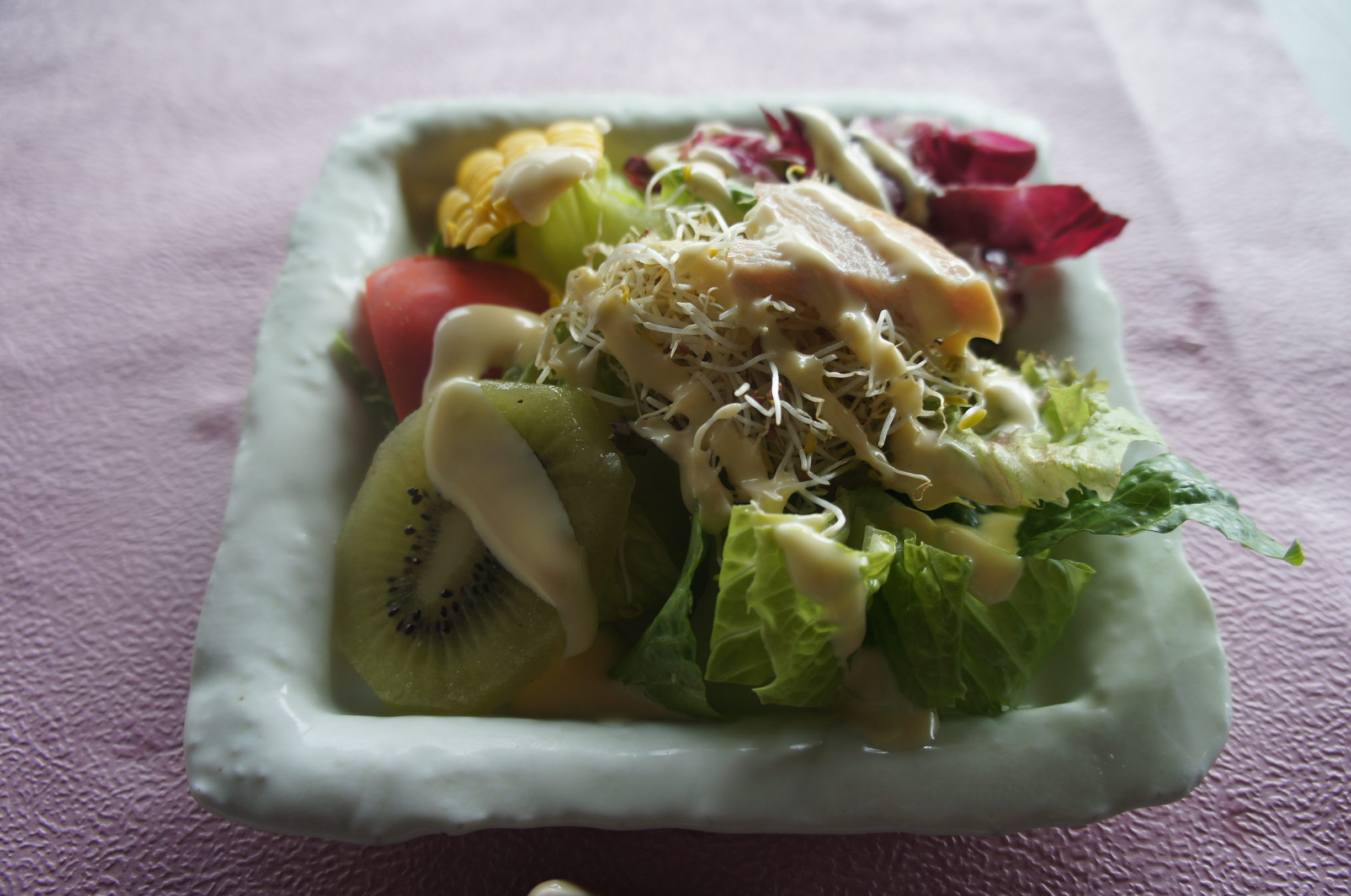 第三道係賣相比較平常嘅雞肉菜沙律,不過調味汁就好蜜味,似乎用某種生果調配,而且今次旅行係我哋第一次見到咁樣一排過嘅粟米呢,成排咁食又冇渣真係唔錯,口感比起一粒一粒更特別~SONY DSC