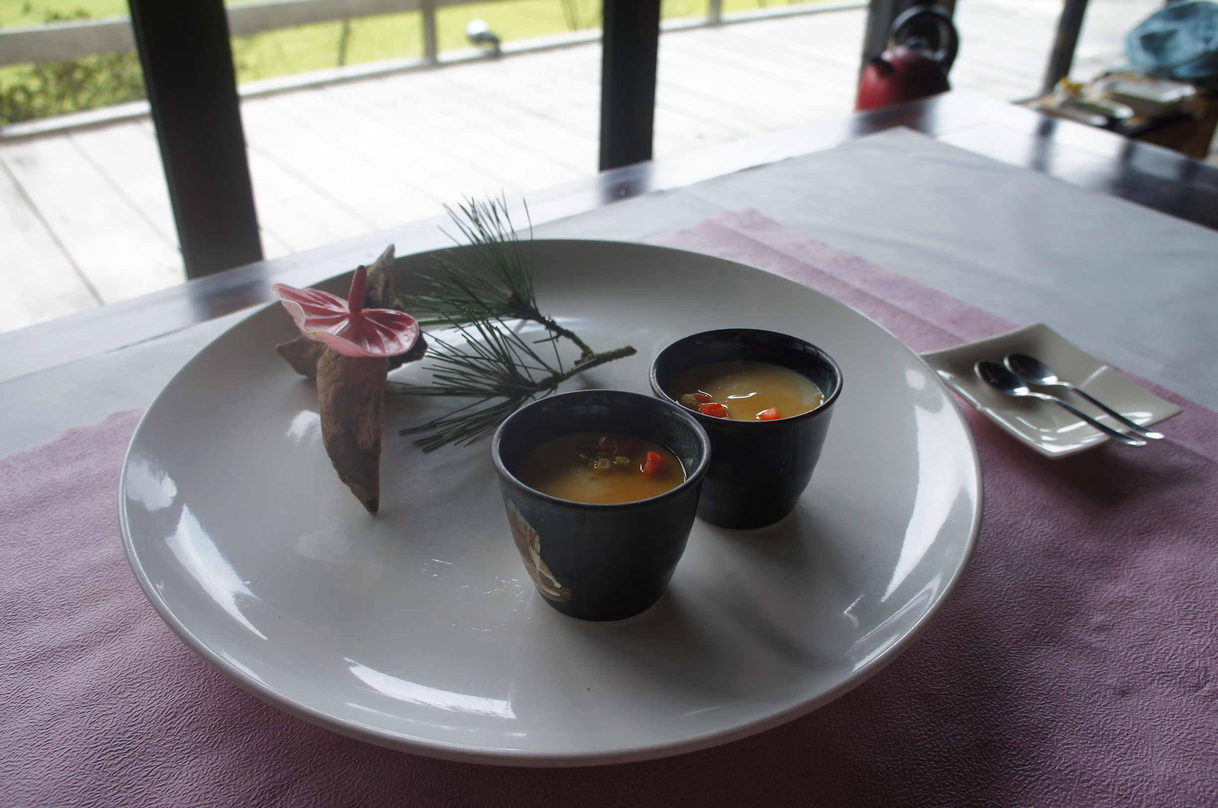 光線問題,呢度咁豐富嘅第五道係影嚟影去都影得唔好嘅綜合冷盤,我都考慮咗一陣要唔要食啲魚生,不過見只係四款,每款每人得一件,呢度啲食物又咁企理,食少少應該唔怕嘅,所以都破戒食咗,不過令人讚歎嘅反而唔係我好耐冇食過嘅魚生,反而係啲蔬菜喎~杯子裡面嘅係醃白蘿蔔,入味得嚟唔嗆喉嚨,食落好順口,脆脆嘅金黃食醃蔬菜片質感好好(唔好意思,我哋兩個都食唔出係咩蔬菜,南瓜?紅蘿蔔?or香港唔常見嘅蔬菜?)改變質感嘅茄子亦唔錯,沾上特製洋葱醬汁都好清新,但我最愛嘅係木耳絲丫,好厚肉好有彈性,係香港真係食唔到﹗我哋食呢道冷盤時不住讚歎台灣人對烹調蔬菜嘅用心,香港出街食飯,蔬菜彷彿係為咗健康而食嘅一樣食物,而唔多餐廳會花心思氣力去研究點樣令佢哋變得好味,但係松園禪林,你會深深感受到廚師們視蔬菜如珍貴嘅食材,用巧手去令佢哋變得更美味,咁先係對食物嘅尊重同埋發揮嘛~讚丫﹗所以即使唔係素食者,我估揀素菜餐單應該都會驚喜不停﹗SONY DSC