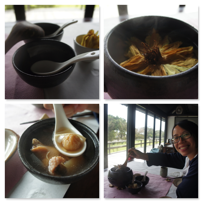 第十道嘅湯真係好勁﹗﹗day話食完之後充滿能量~未開始品嚐之前先將蓮花乾放上面,蓮花乾係湯面盛放除咗靚之外,仲等香味滲透係湯汁入面~2分鐘後撈起蓮花,可以開始食了﹗材料好豐富呢,雞有啲硬反而食唔到幾多,但入面嘅其他餸菜我哋都食咗好多丫,最濃烈嘅有新鮮竹筍啦、鮮淮山啦、細細粒嘅無花果啦(最初我哋以為係栗子)、牛蒡啦⋯係咪充滿能量呢~落咁多材料,湯嘅味道當然好鮮美啦,我呢個湯王絕對最後一滴都唔可以放過丫~SONY DSC