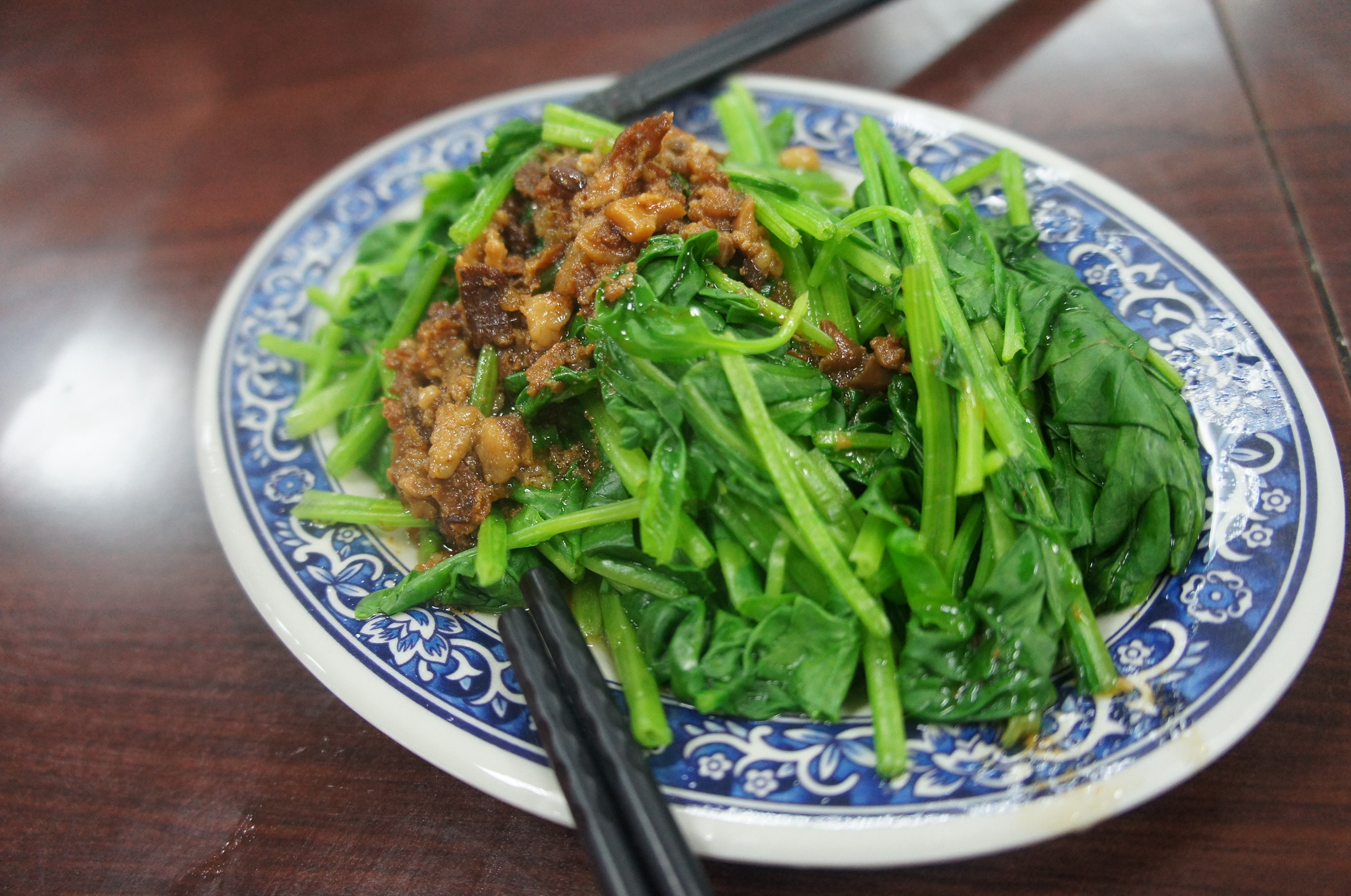 大食二人組除咗一人一碗牛肉麵之外,仲忍唔住係咁抵食嘅地方叫多幾樣嘢,我哋食咗燙青菜,似乎燙青菜就等於菠菜+肉燥?尋晚嘅外賣宵夜都係咁嘅配搭﹗不過呢個少油啲、清新啲,感覺到食菜嘅健康感覺~