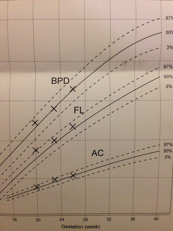 BPD=頭仔直徑;AC=肚圍;FL=大脾骨長~原來近三次條線都好接近並沿著中間嘅50 percentile線呢,非常好~希望之後嘅14個星期都順順利利啦﹗﹗BB呱乖乖,媽咪錫錫~