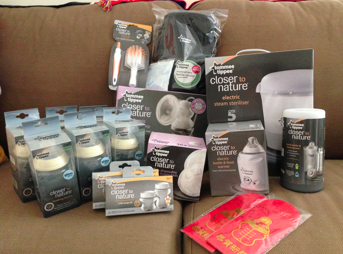 之後就係幾項大手筆了﹗最誇張(主要係最bulky同埋最重)係奶泵套裝~事前同day睇過大家常用嘅幾款奶泵,好多人推薦嘅Medela、令人有信心嘅Philips旗下嘅Avent、同埋近年開始hit嘅Tommee tippee,開頭屬意Avent㗎,雖然Medela有好多身邊嘅人話好,主要係泵得快,電雙泵的話20分鐘搞掂,但我上網睇片覺得組件好多,怕自己每次拆開清洗消毒之後再組裝會好麻煩,所以就鍾意Avent夠簡單,Tommee tippee印象反而唔係太深刻,但感覺個奶樽乳房像真度咁高都好有好感~今次BB展我哋首先行到Tommee tippee個booth,個promotor姐姐非常熟書,介紹得好清楚之餘又令人有好感,所以我哋買咗「New Mother Starter Set」,套裝包奶泵+6個奶樽+奶瓶消毒器+暖奶器+乳墊+奶樽刷,我哋再upgrade手泵做電泵同埋upgrade膠奶樽做玻璃奶樽,另外加配冰袋冰種同埋儲奶瓶蓋子,佢再送多個手攜式暖奶器+利是封,全部東東$2000有找,真係好抵丫﹗﹗詳細用後感大家期待我將來嘅blog blog咯~