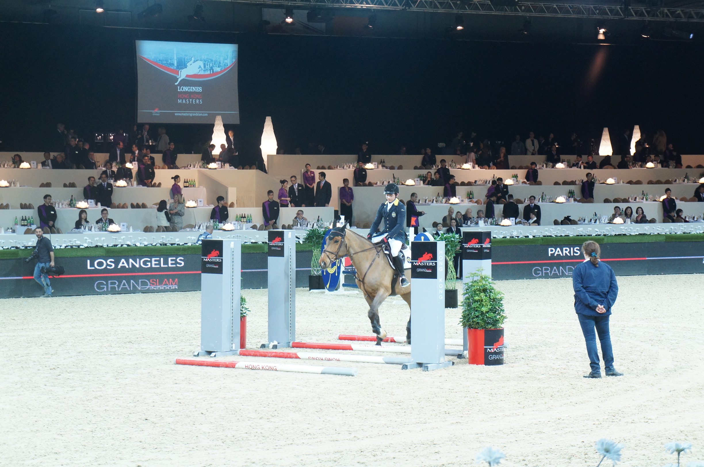 兩個專業旁述同埋一個美女主持人亦落場順住賽道行一圈,介紹俾觀眾聽今個比賽嘅特別之處,螢光幕上面就顯示咗賽道,其實啲欄只有1234嘅number,選手要記住順序㗎~旁述介紹俾我哋聽各個欄嘅難度,例如4ABC就係三個欄嘅combo,個rhythm要掌握得好,5號欄有小水窪係底,馬可能會驚驚,另外又有個唔記得幾多號欄,佢係一個double欄,而兩支桿嘅高度係一樣的,即是馬馬係遠處會以為只有一支桿,呢個又要考起選手點樣同馬配合得好了﹗不過主持人講嘅幾個特別難關似乎選手們特別小心呢,馬有踢跌得多嘅反而係另外一啲欄呢~SONY DSC