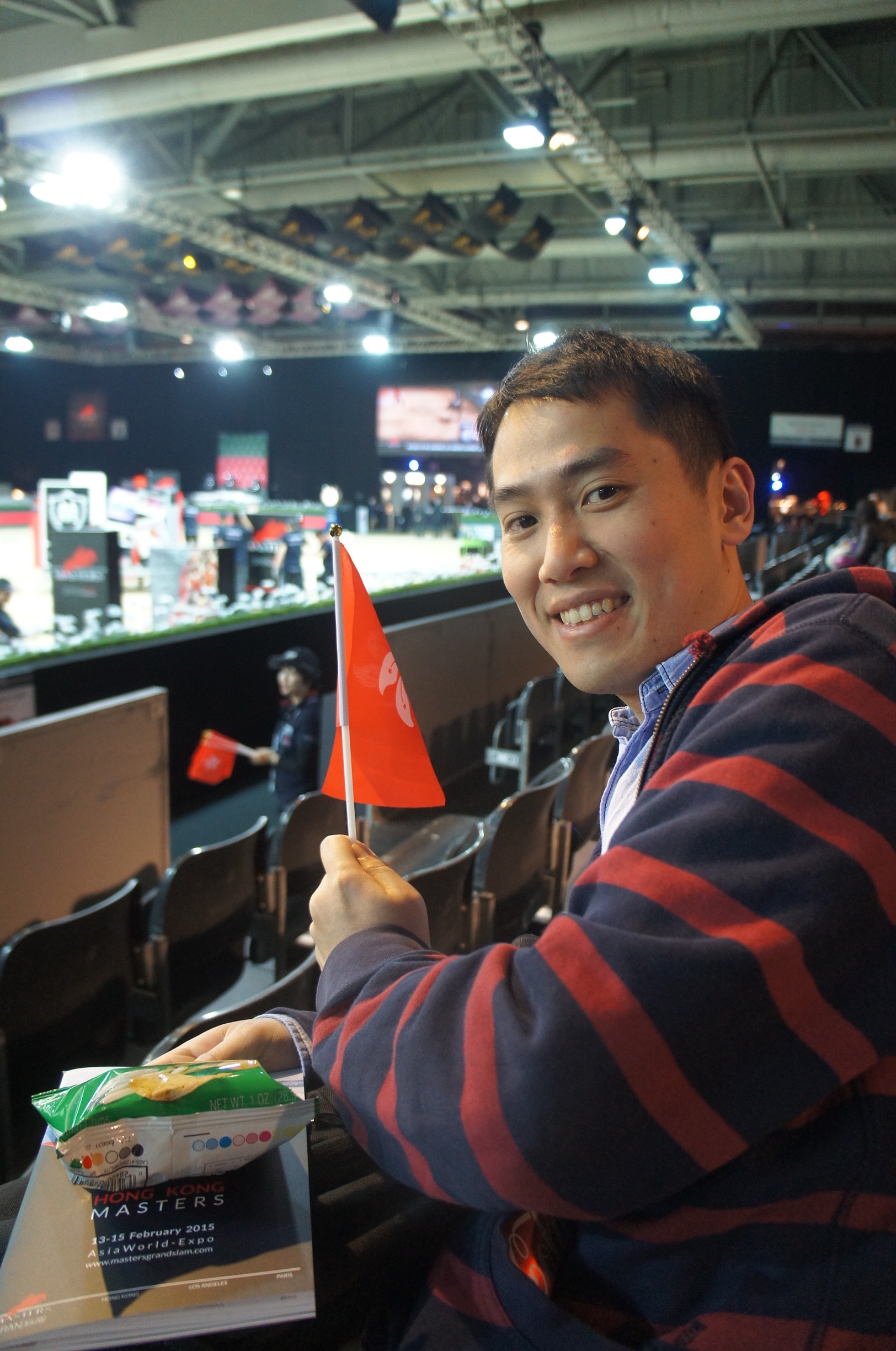 我哋買咗少少零食,重新入座﹗原來Gucci Gold Cup有一位香港選手參賽,特區小旗係工作人員派俾我哋,等大家幫香港選手打下氣呢,雖然最終表演未如理想,但有香港人參加大師賽都好威水啦~SONY DSC
