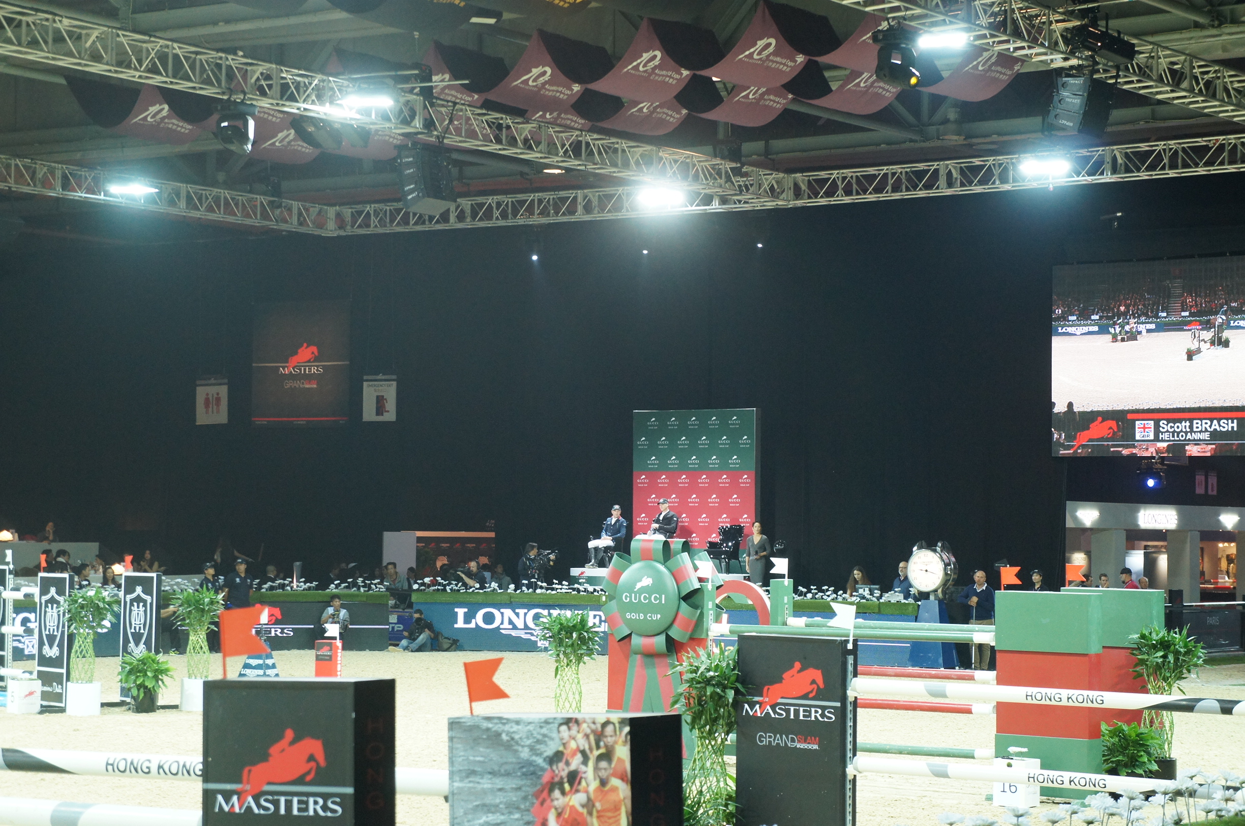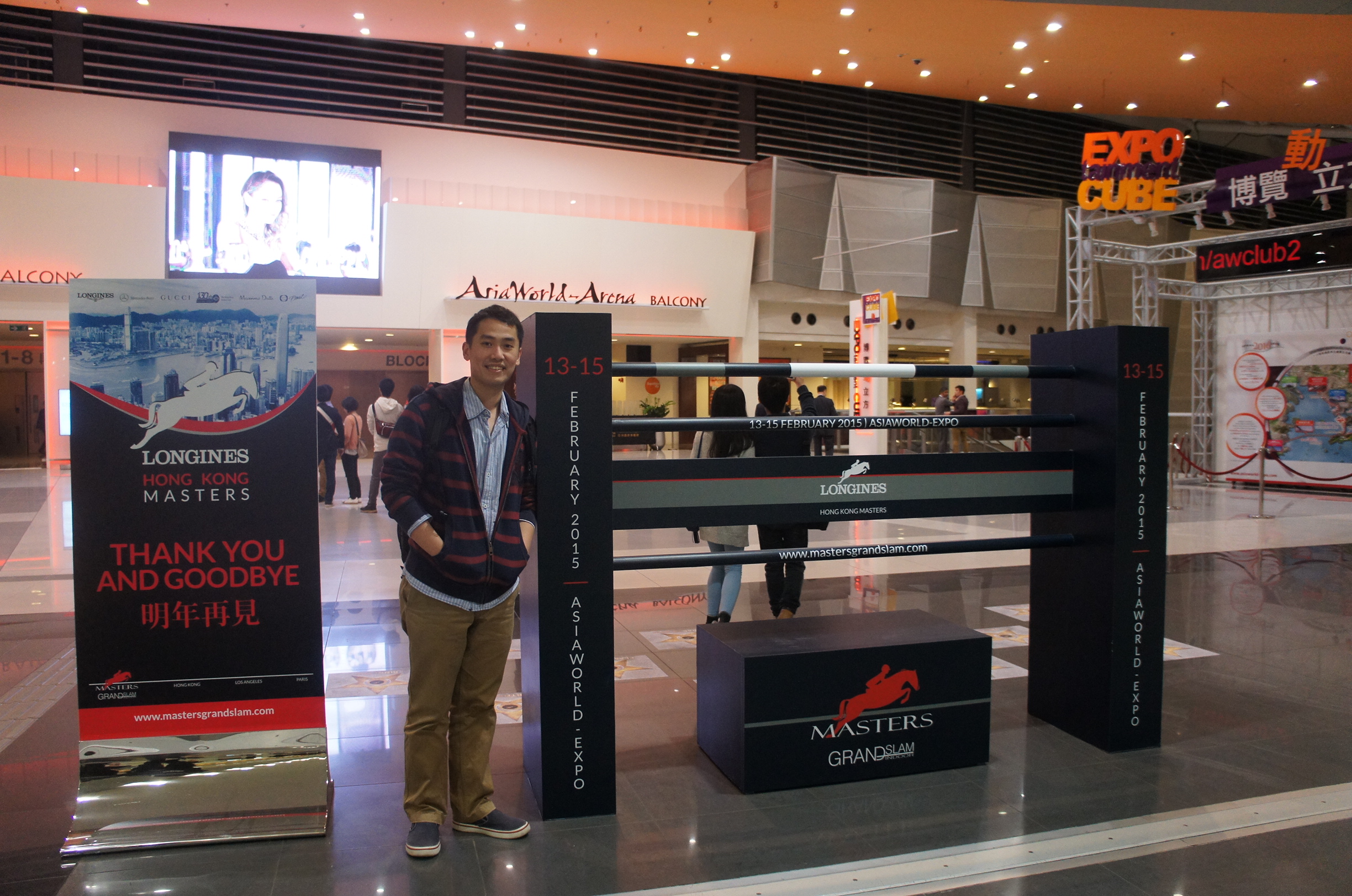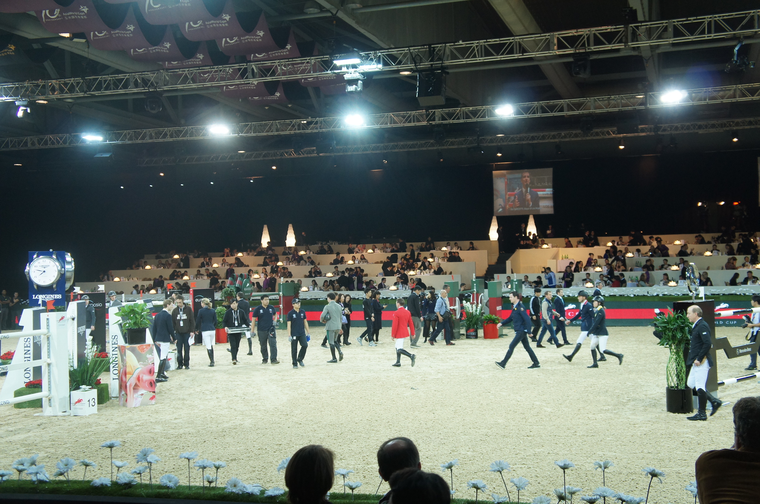 我哋重新入場時個場都未set好~原來每一個賽事嘅setting都完全唔同,而選手亦只能夠比賽前行落去一次視察場地,馬馬就唔可以視察了~欄嘅design除咗有各個贊助商嘅大logo之外,仲有好多香港特色呢,我哋見到相入面有龍舟,另外又有啲欄係搶包山同埋燒賣,啲馬會唔會俾佢哋吸引住唔專心?SONY DSC