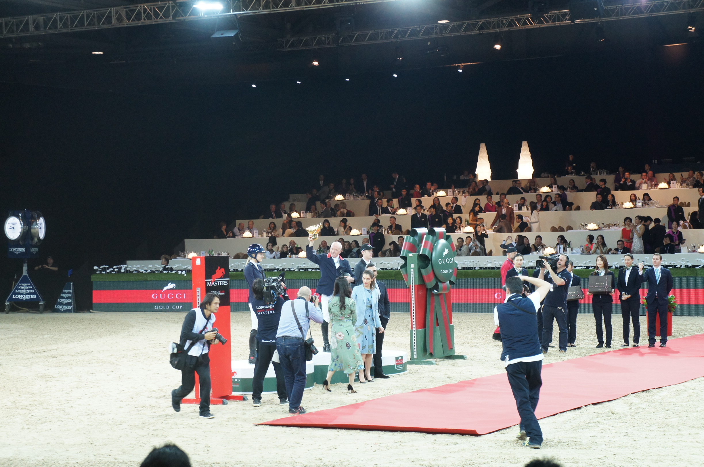 比賽最後18歲妹妹得亞軍,而冠軍都係老練嘅選手,嚟自英國嘅John Whitaker得到呢,呢個大叔真係好勁,我賽後都忍唔住wiki一下佢,原來佢1955年生,即是今年生日就六字頭了,真係寶刀未老呢,而且國際賽事經驗豐富,而且家族都係馬術運動員呢,有好多個Whitaker都係唔同賽事競逐,好似今晚都仲有另一個Whitaker添~得獎嘅組別除咗人可以上台拎獎之外,佢嘅partner肥壯馬亦有得披上錦袍,一齊分享光榮﹗頭先我咪話唔可以以貌取馬嘅,老當益壯嘅Whitaker隻馬正正係馬腳好短身裁肥大跑起來呼呼呼的,但居然為主人奪冠,勁﹗