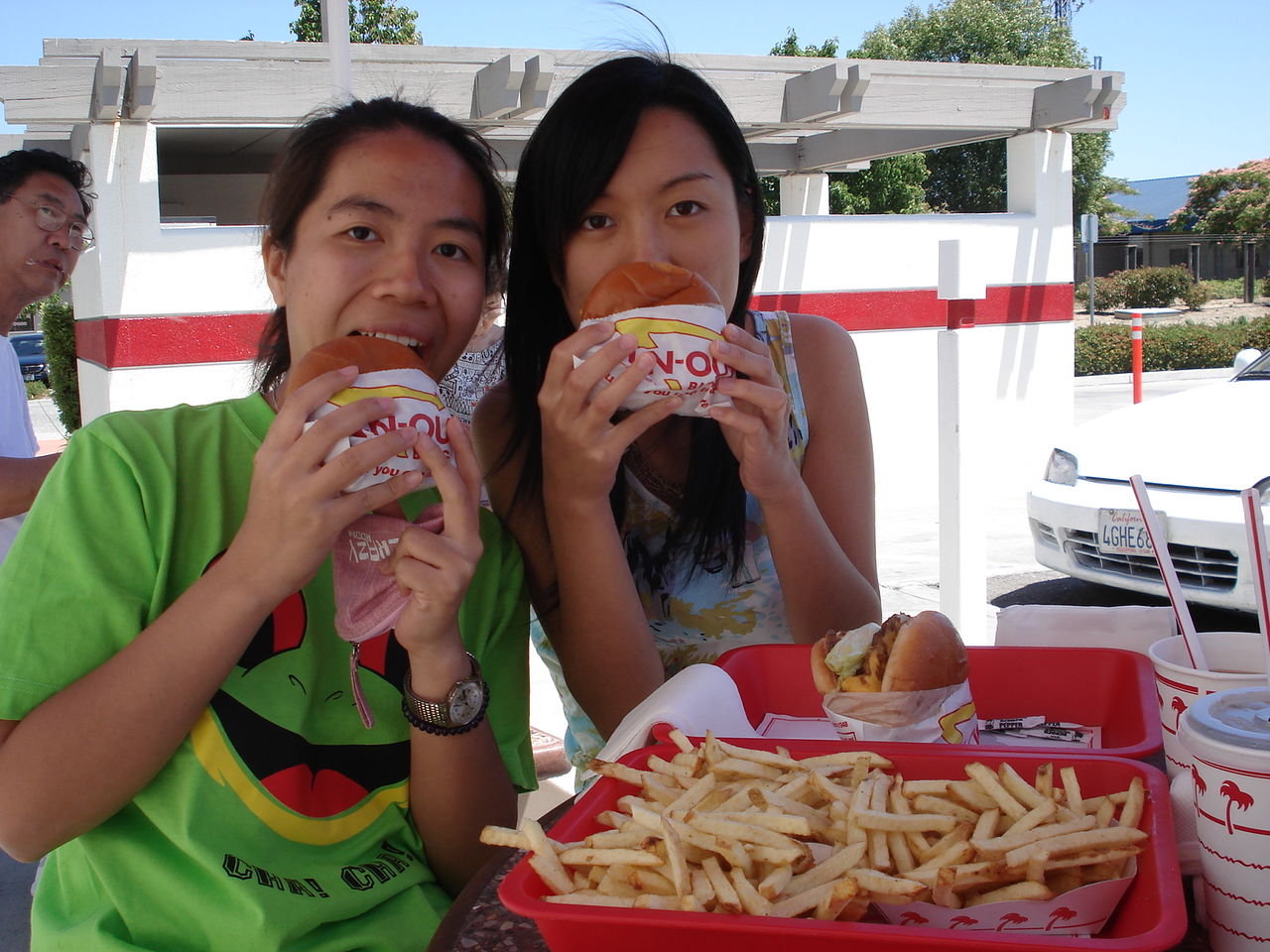in and out主張健康o既食物,所有材料都冇冷藏過,漢堡用新鮮牛肉o黎做,薯條都係用新鮮薯仔切成,好好味呀~佢個menu就只有三款飽,普通hamburger、cheeseburger同埋double double (其實即係兩層o既cheeseburger),三款飽就維持到生意,勁﹗我就咁要hamburger咋,因為驚D cheese會遮住D牛肉o既味﹗