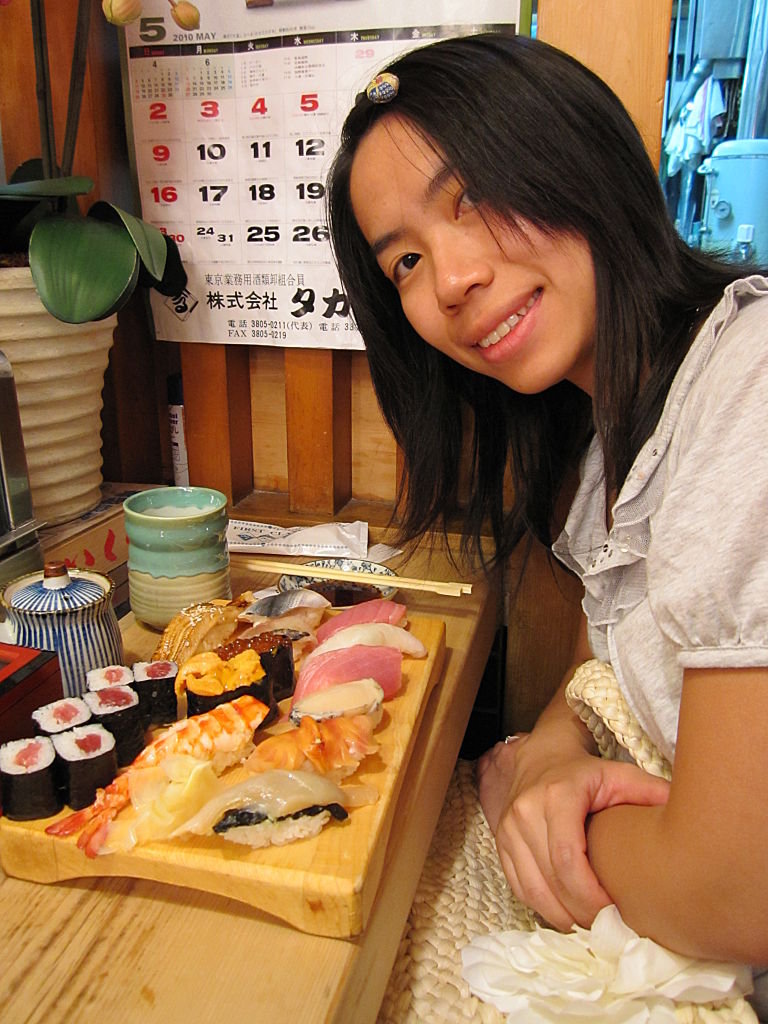 真係食到勁飽呀﹗壽司店有兩個師傅,老司傅負責握壽司,佢個partner就負責卷壽司、軍艦卷,同埋啲鰻魚壽司,鰻魚一早就烤熟,佢主要係烘一烘表面令佢焦焦地,同埋塗上汁汁~老司傅好有幹勁o架,完成一份壽司端俾客人時就大叫「登登~~」咁﹗見佢握壽司時真係喜孜孜o既呢~非常好﹗