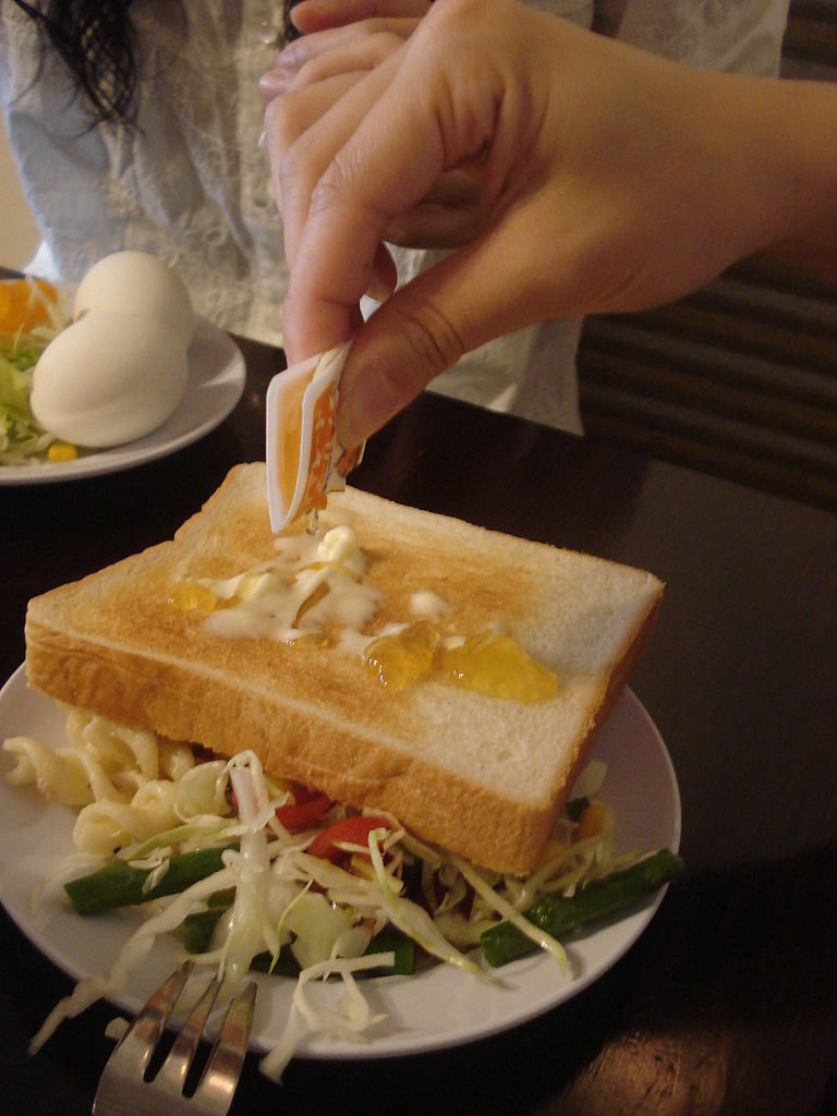 好鍾意呢個果醬牛油packaging呢﹗只要係中間一「啪」,果醬同埋牛油就會係D洞洞擠出o黎,非常乾淨俐落,又可以混合得好好﹗家姐好鍾意隻紅豆味~不過對於高高o黎講就慘D啦,因為佢唔鍾意食牛油~