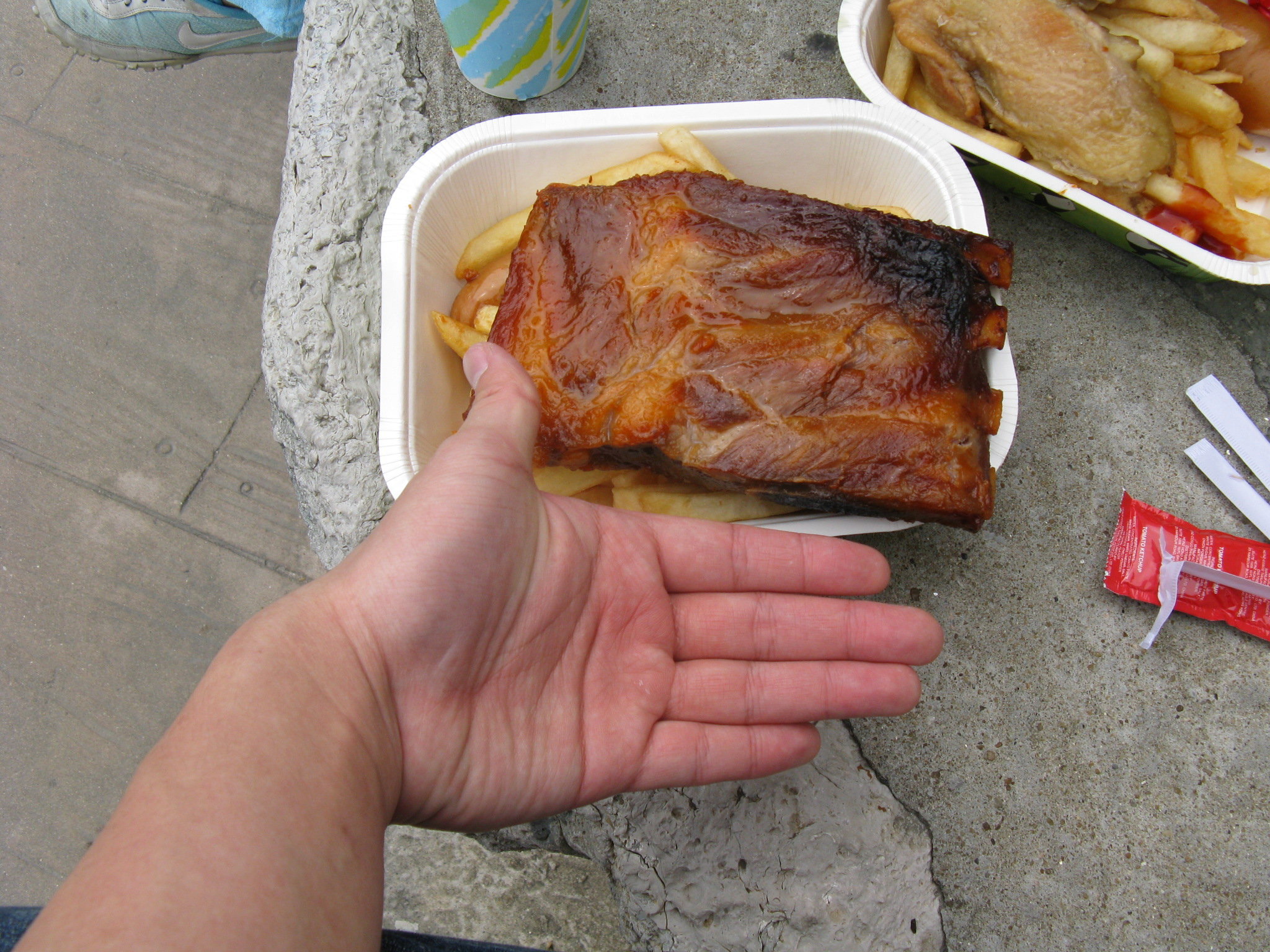 我o地叫o左兩個餐,每份都有薯條、巨腸同埋汽水,分別在於個主菜,我o地揀o左一款金沙骨,另一款雞扒,都唔知點解D o野食咁巨?﹗因為我o地坐係當眼處jap jap jap,路過o既人,100%都會望實我o地+評論﹗好誇張呀~間鋪頭應該俾番廣告費我o地呀~
